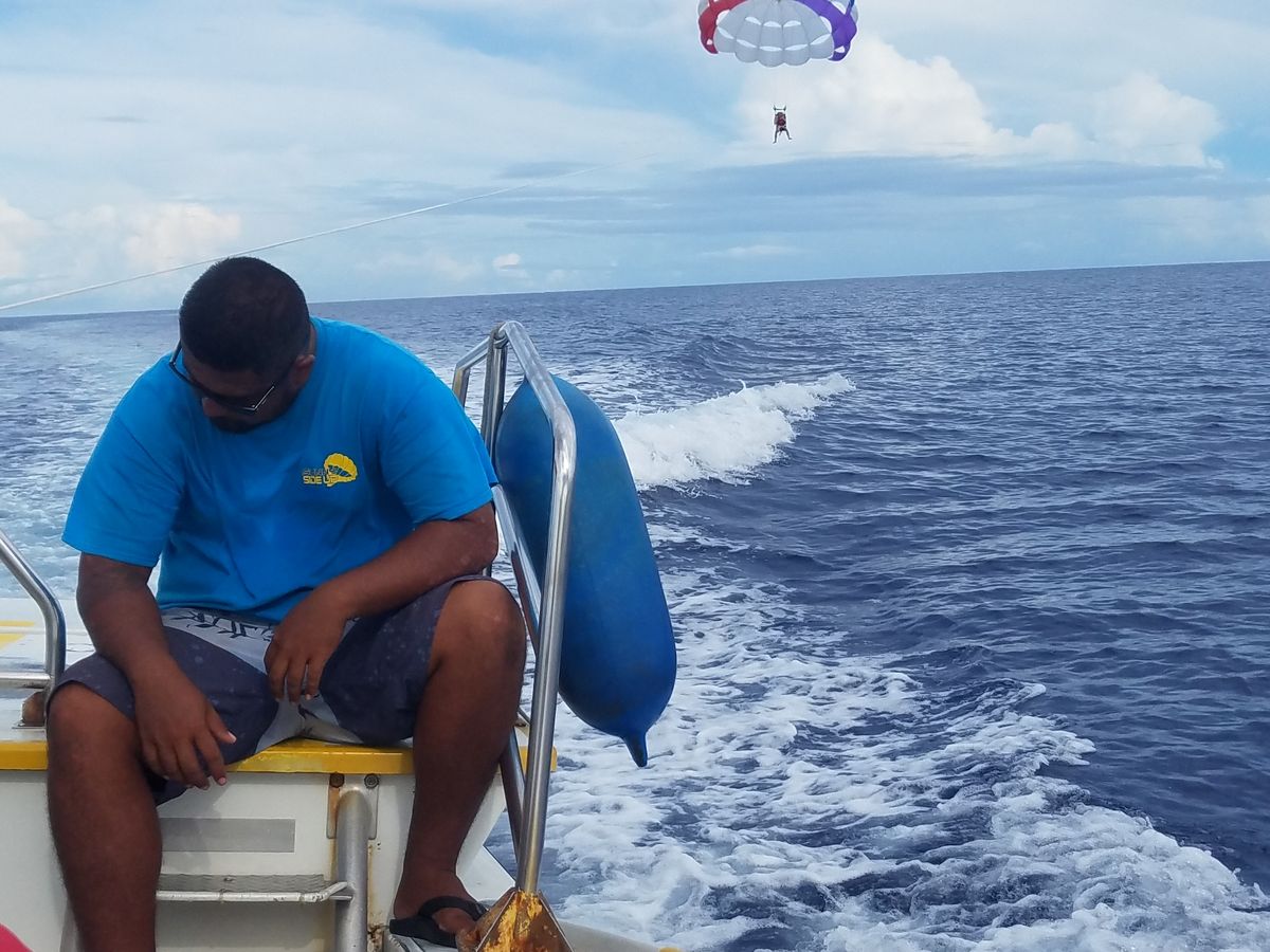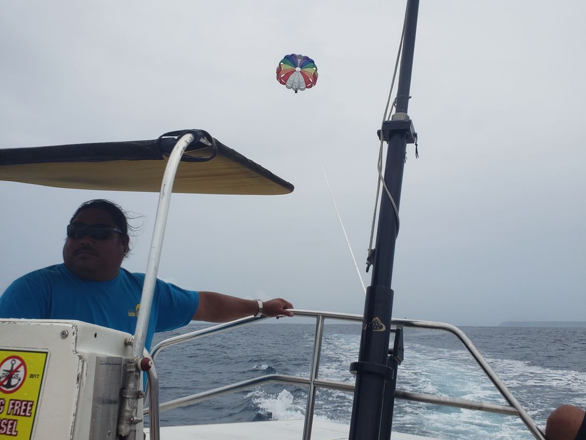 パラセーリングのポイントまで行くまでの船でスコールに当たりそうな予感がしましたがドライバーが上手く避けてくれて無事気持ちのいいパラセーリングが体験出来ました!そのあと近くの展望塔から日本では見ることの出来ないような熱帯魚を見ることが出来てこちらはツアープランに記載がなかったのでお得に感じました。イルカウォッチングではイルカの大群に3.4回遭遇することが出来、イルカが姿を現した際には近くに寄ってくれました!帰りにたまたまウミガメをみることもできました!もしイルカが見れなくてもギフトなど特典があるそうです。とてもいい体験をすることが出来ました!ありがとうございました!!