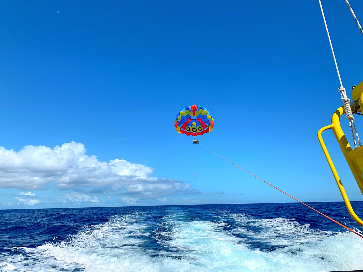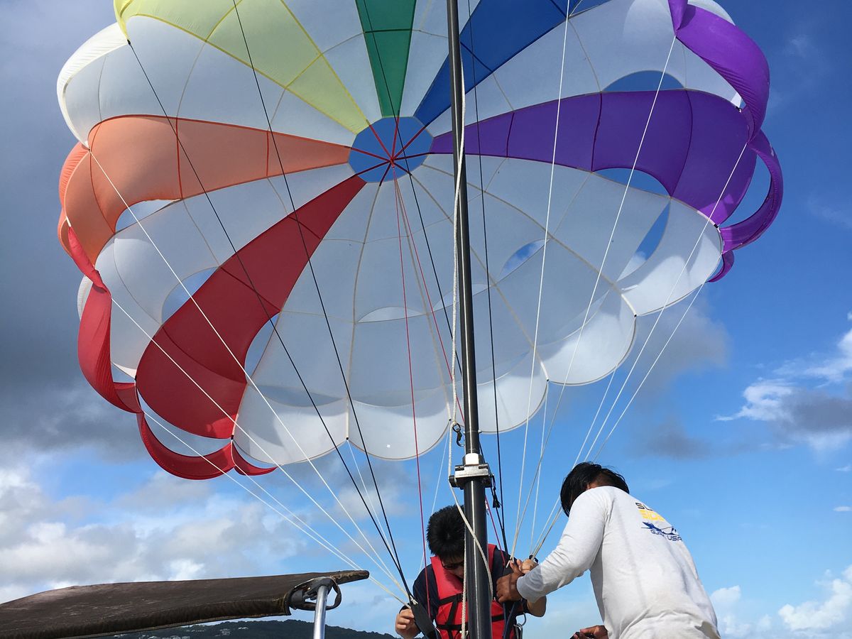 まずはパラセーリング。他のお客さん4名とボートに乗り、2名ずつパラセーリングを体験しました。上空からの眺めは絶景で、風が気持ちよかった!