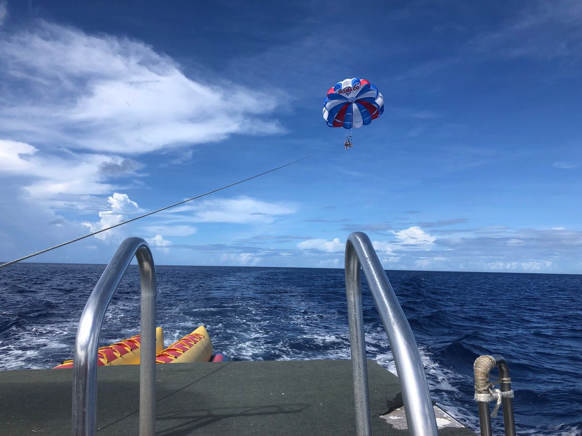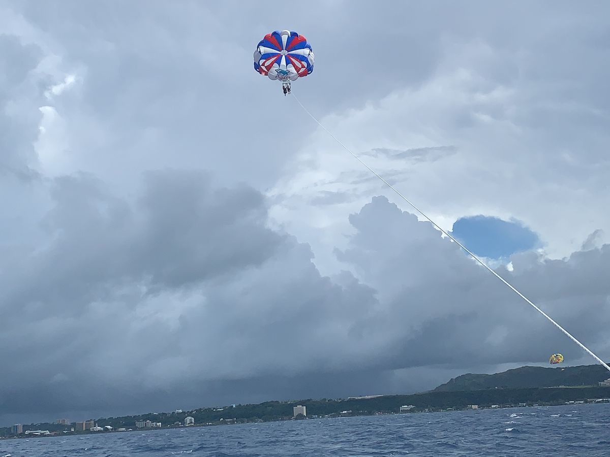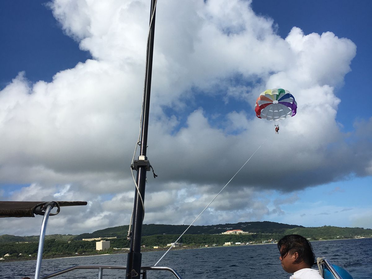 私達はツアーでパラセーリングとイルカウォッチングを楽しみました。 パラセーリングではガイドさんのいたずらで、紐を上げ下げされ絶叫アトラクションのうな雰囲気を楽しめました。笑 景色は、残念ながらスコールでクラウディでしたが、グアムのホテル街を一望できて良かったです。