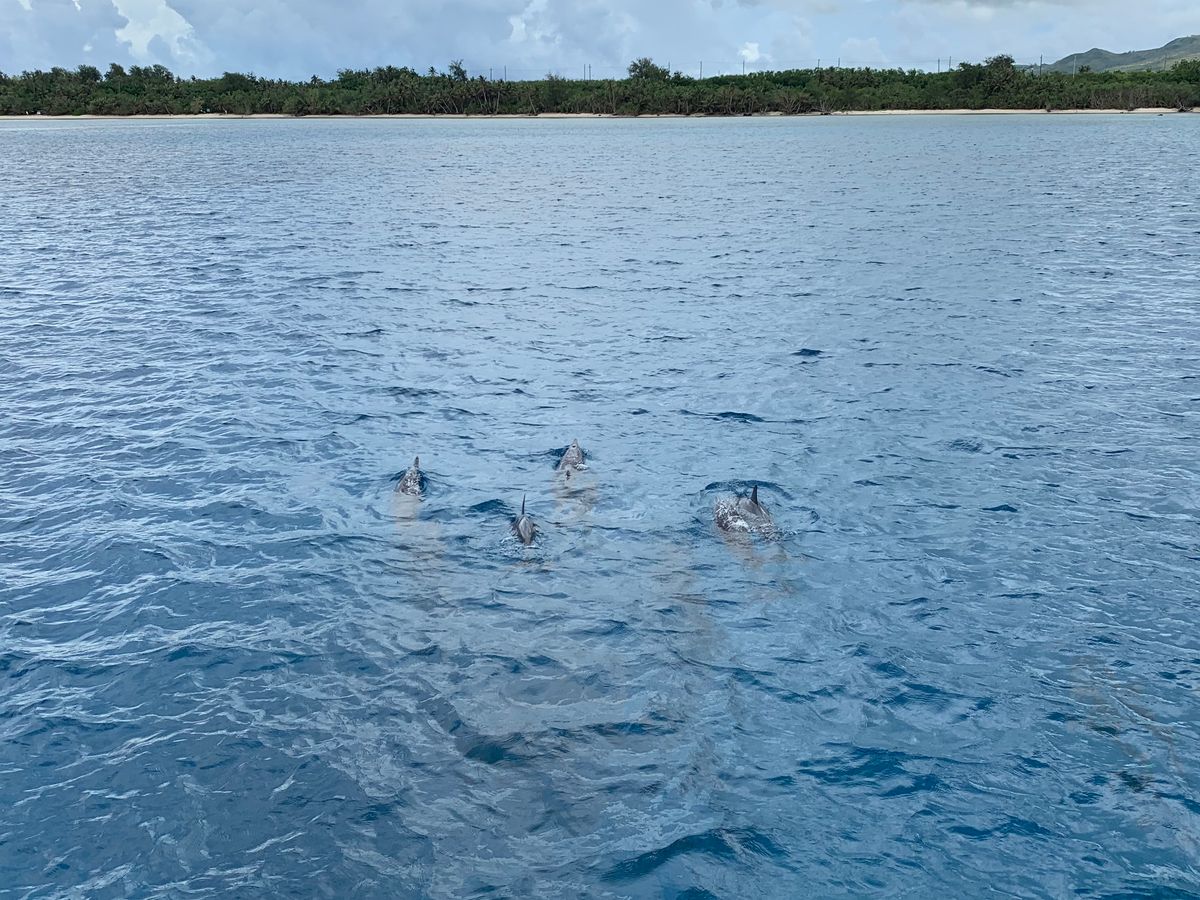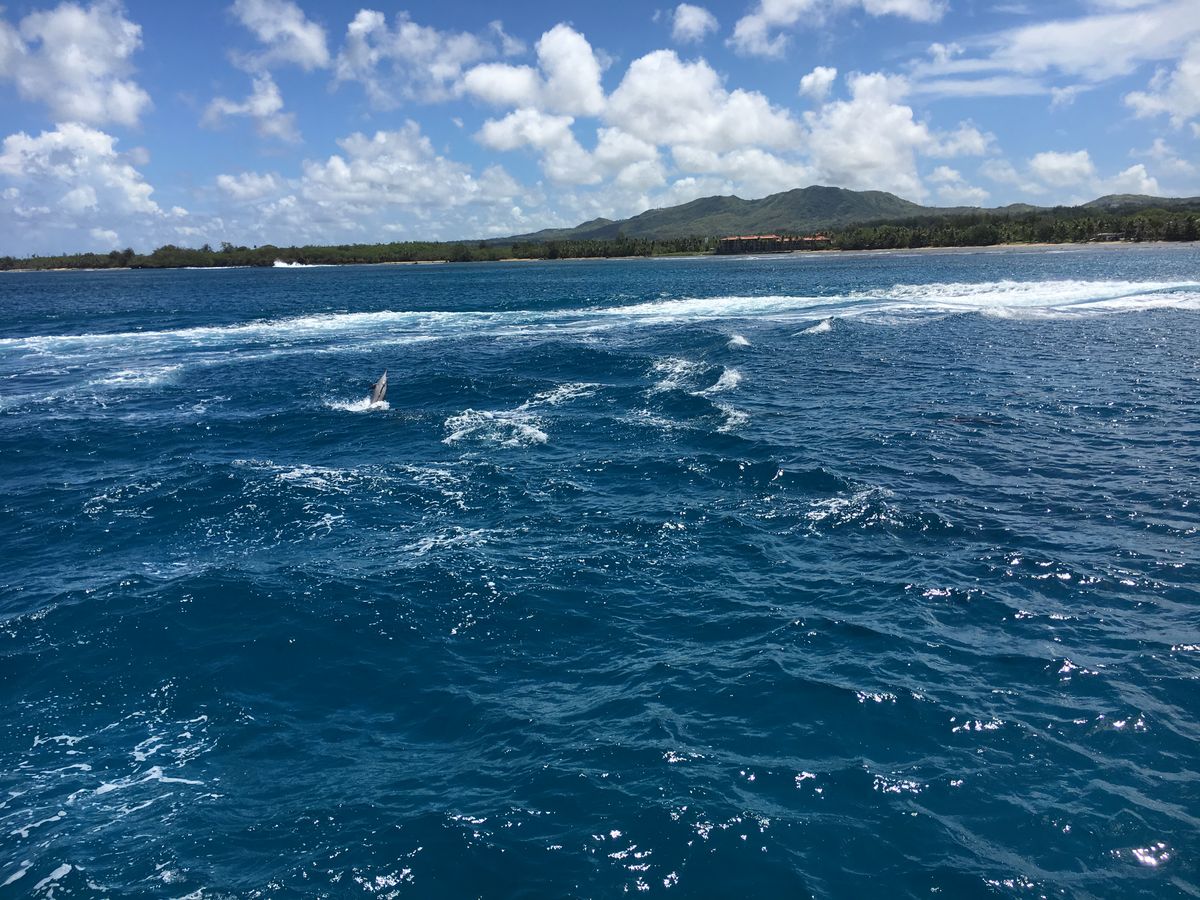 イルカウォッチングでは初めて野性のイルカを見る事ができて大興奮でした!イルカスポットまでグアムの真っ青な空と海を感じる事がでかてまるでクルーズのようで、幸せでした。ですが、合計1時間ほど船上で、船酔いしてしまい、帰りはダウンしてしまったので、酔いやすい方は酔い止め必須です。また、直射日光、海での紫外線の跳ね返りも強いため、サングラス、ラッシュガード等を着るのがオススメです。 最後にお昼ビュッフェがあり、また船上でマンゴージュースを貰えてお得です!船酔いであまり食べれませんでしたが。フィッシュアイさんは、食べるところも雰囲気がよく、生でウクレレを弾いてくれるサービスもありました。