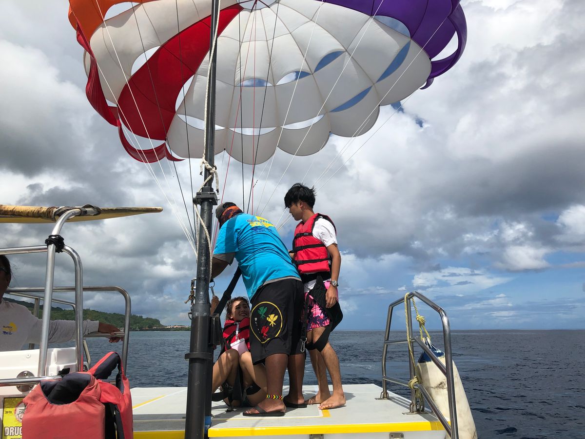 まずパラセーリングをしましたが、グアムの綺麗な海と景色が見えてとても気持ち良かったです。空にいた時間は10分程度だと思っていましたが、体感では2〜3分くらいでした。ものすごく楽しかったです。