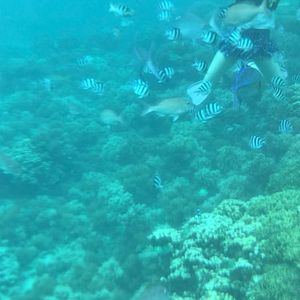 シュノーケリングの餌付け体験もなかなかグッド!たくさんのお魚がすぐにやってきます。間近でお魚と遊べます。