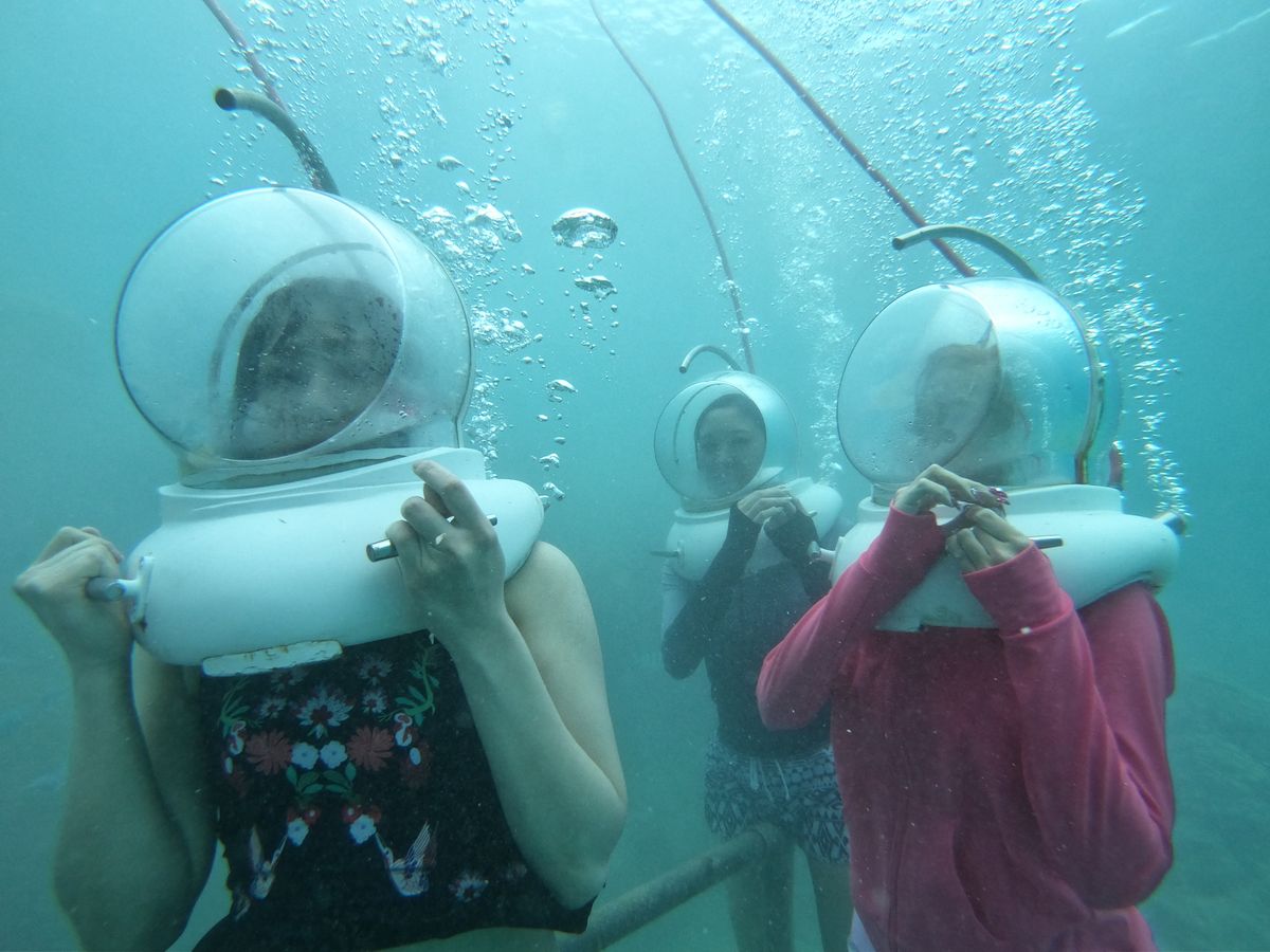 【アクアウォーク】アクアウォークの前にお弁当(とんかつ?とジュースなどは飲み放題!)の時間がありました。アクアウォークも初体験でしたが、耳抜きの仕方を現地のインストラクターさんがちゃんと教えてくださったので、あまり耳も痛くならずに済みました!水中カメラがあるといいと思います!セットでシュノーケリングもできました。魚とてもきれいです!