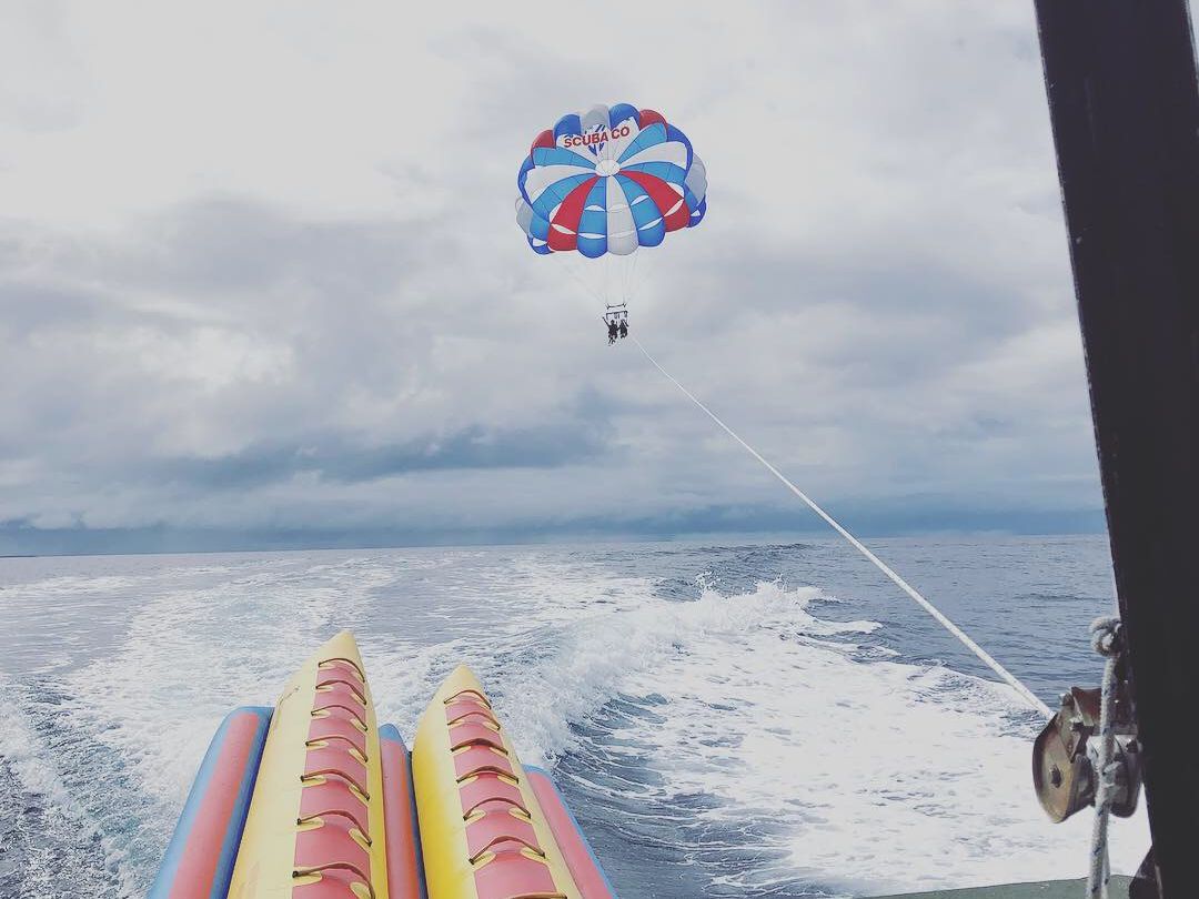 アクテビティポイントまで約10分、順番にパラセーリング。私達は約5分の空の旅、予想以上に高く、当日はそこそこ風もあったため、スリルもあり楽しかったです。最後に頭まで思いっきり海に落とされるのが最高に楽しかった!