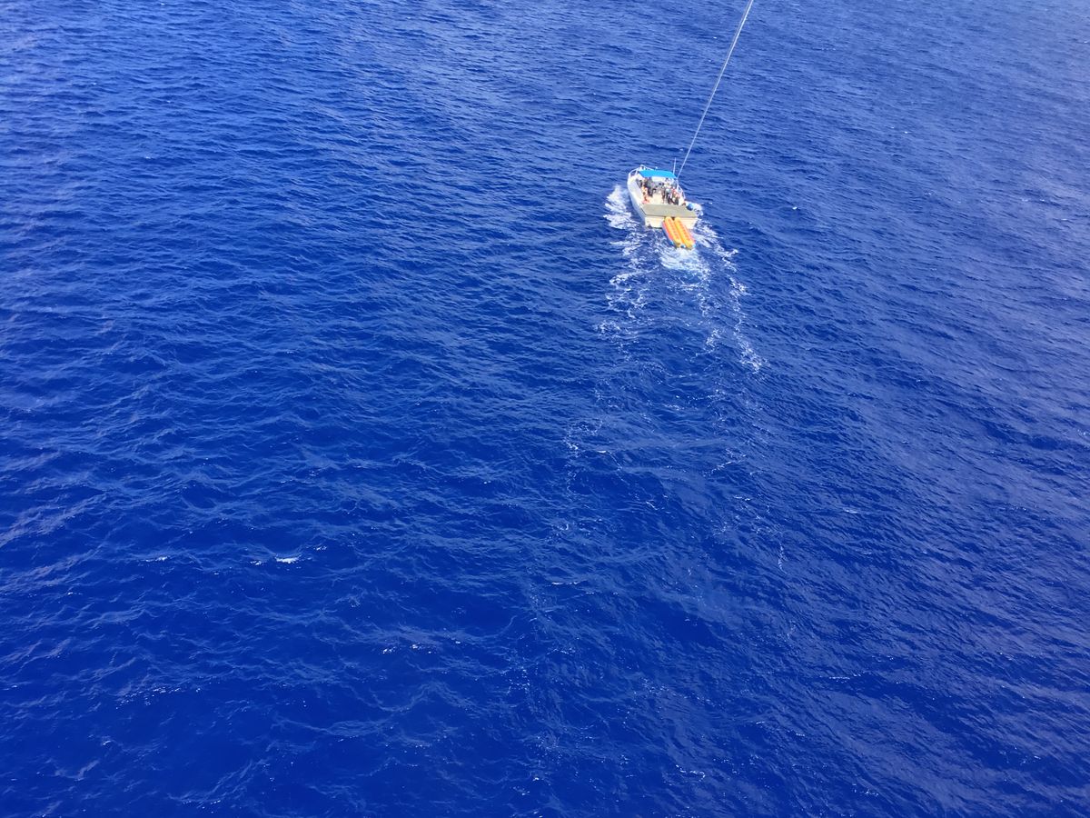 水着でしたが、海に落とされることは無く、ちゃんと繋がるロープを機械で巻いて船へ回収してくれるので、濡れることはありませんでした。