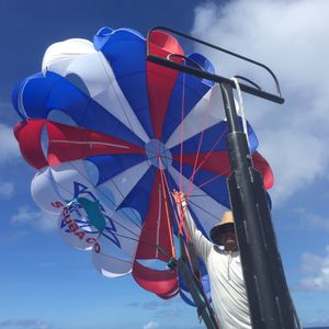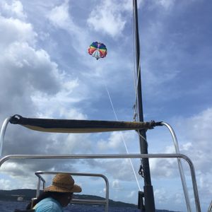 今回初めてパラセーリングを体験しました。こちらのパラセーリングは、ベンチ付属ではなく、ハーネスを付けてからだ一つで舞い上がっていくので高度があってスリル満点&眺めが最高!!二人同時に飛べるので空中で会話も出来ます。(一人参加の場合は、スタッフさんにお願いすると一緒に飛んでくれるようです) 参加される場合は、①水に濡れてもOKな服装(水着でなくても良いですが、船のベンチや水しぶきで濡れる可能性あり)②船酔い注意(波があると揺れます)に留意すると楽しめると思います!日本ではなかなかお目にかかれない絶景なので、おススメです!