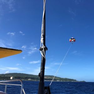 天候が悪く諦めかけていましたが、タイミングを見て下さりすることが出来ました。ただ、台風のせいで波が高く、パラセーリングスポットに行くまでの船がかなり揺れました。