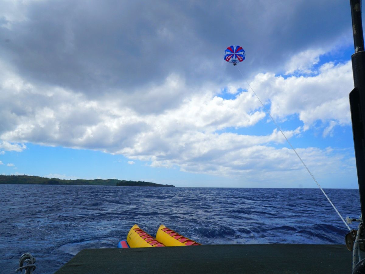 タモンからアガットベイまで約40分、グアムの街並みや海岸線を楽しみながら移動した後に、船で沖に出てパラセーリングとバナナボートを体験しました。