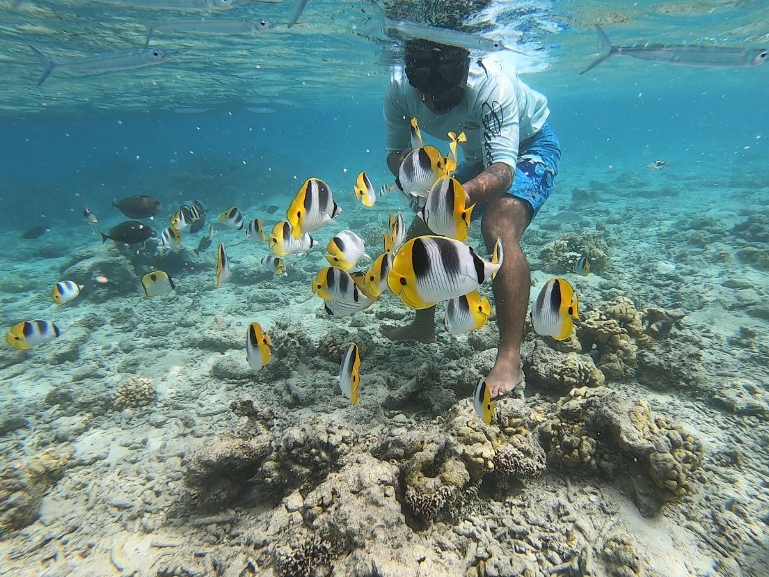 シュノーケリングは、とにかく海水の透明度が高くてキレイ。浅いところから、少し深いところへ移動して、インストラクターから手渡されたえさを持っていると、魚たちが寄ってくる、寄ってくる!