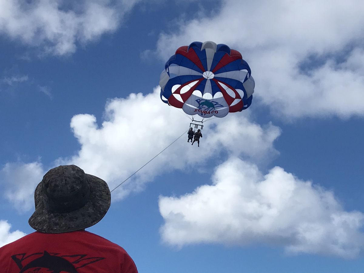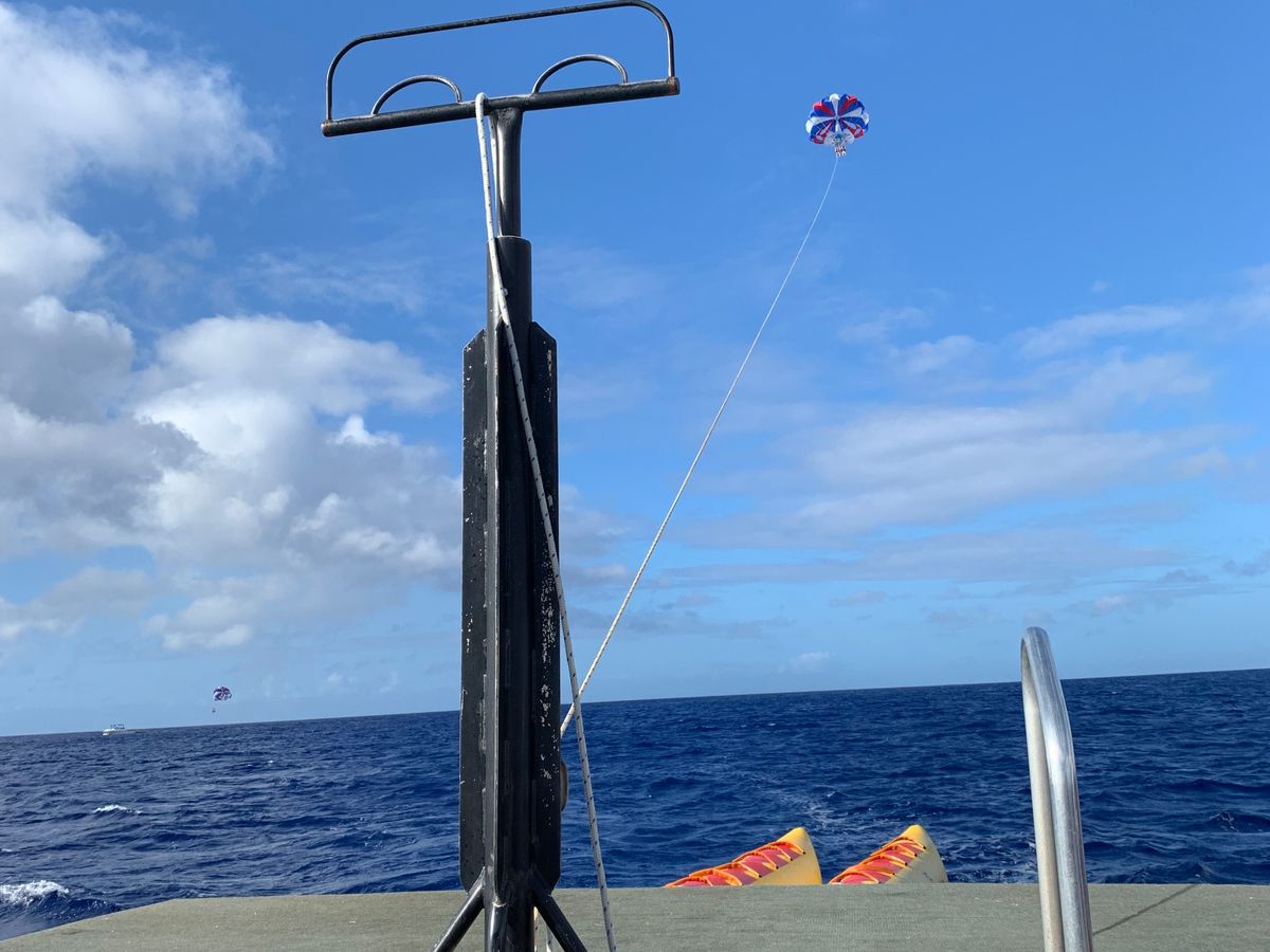 天候が悪く諦めかけていましたが、タイミングを見て下さりすることが出来ました。ただ、台風のせいで波が高く、パラセーリングスポットに行くまでの船がかなり揺れました。
