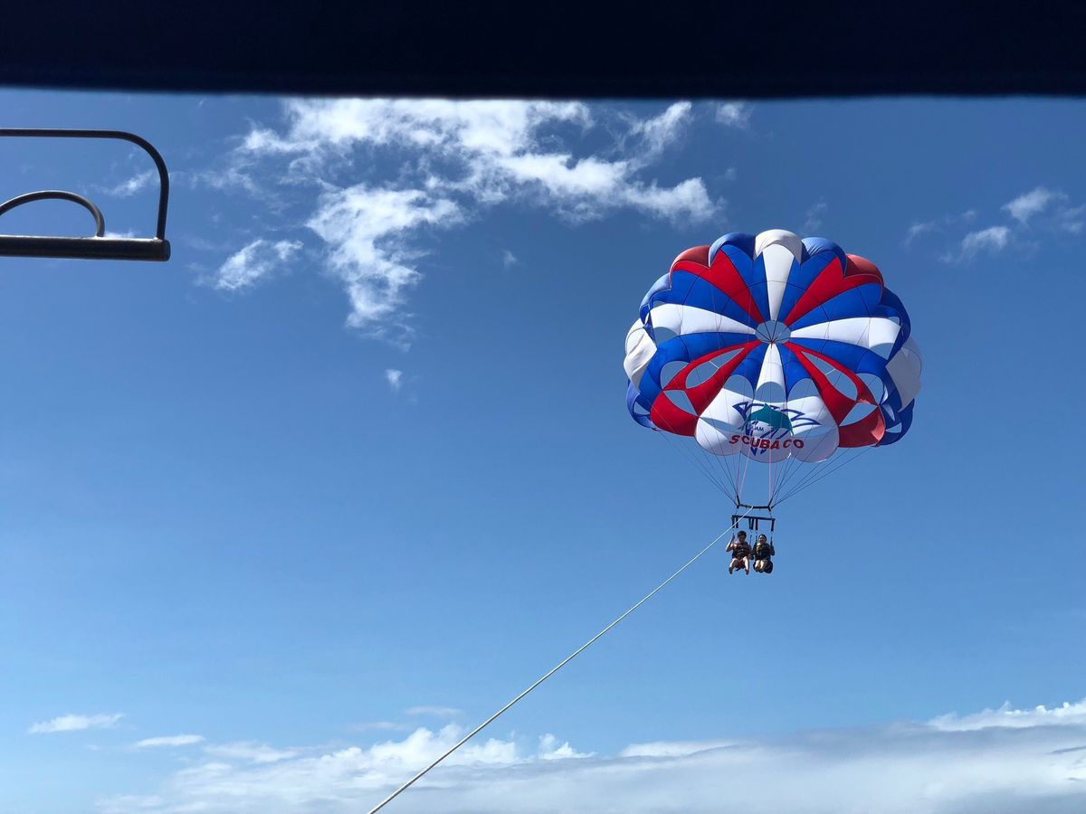 今回初めてパラセーリングを体験しました。こちらのパラセーリングは、ベンチ付属ではなく、ハーネスを付けてからだ一つで舞い上がっていくので高度があってスリル満点&眺めが最高!!二人同時に飛べるので空中で会話も出来ます。(一人参加の場合は、スタッフさんにお願いすると一緒に飛んでくれるようです) 参加される場合は、①水に濡れてもOKな服装(水着でなくても良いですが、船のベンチや水しぶきで濡れる可能性あり)②船酔い注意(波があると揺れます)に留意すると楽しめると思います!日本ではなかなかお目にかかれない絶景なので、おススメです!