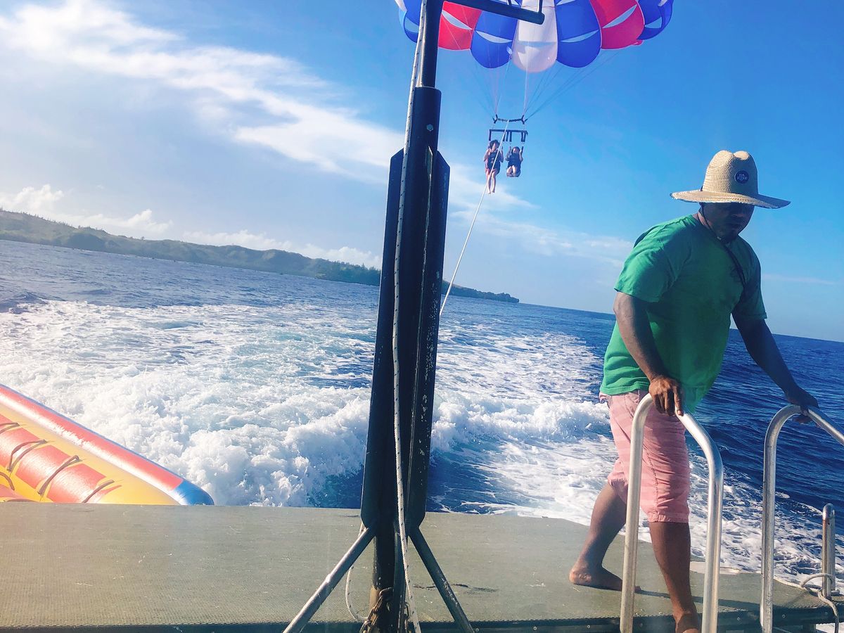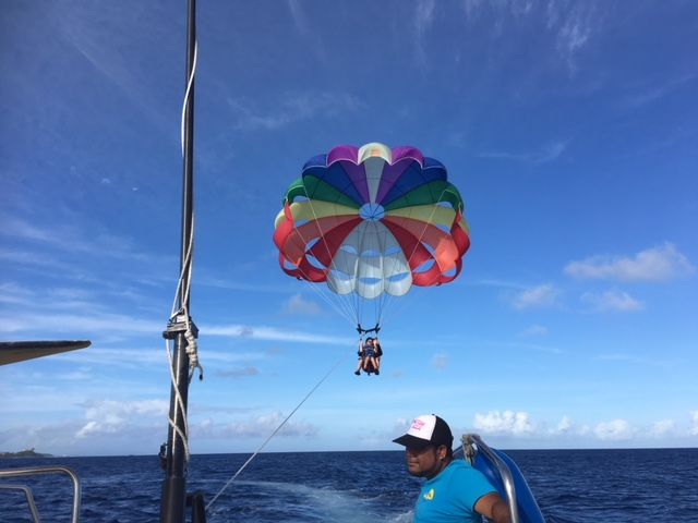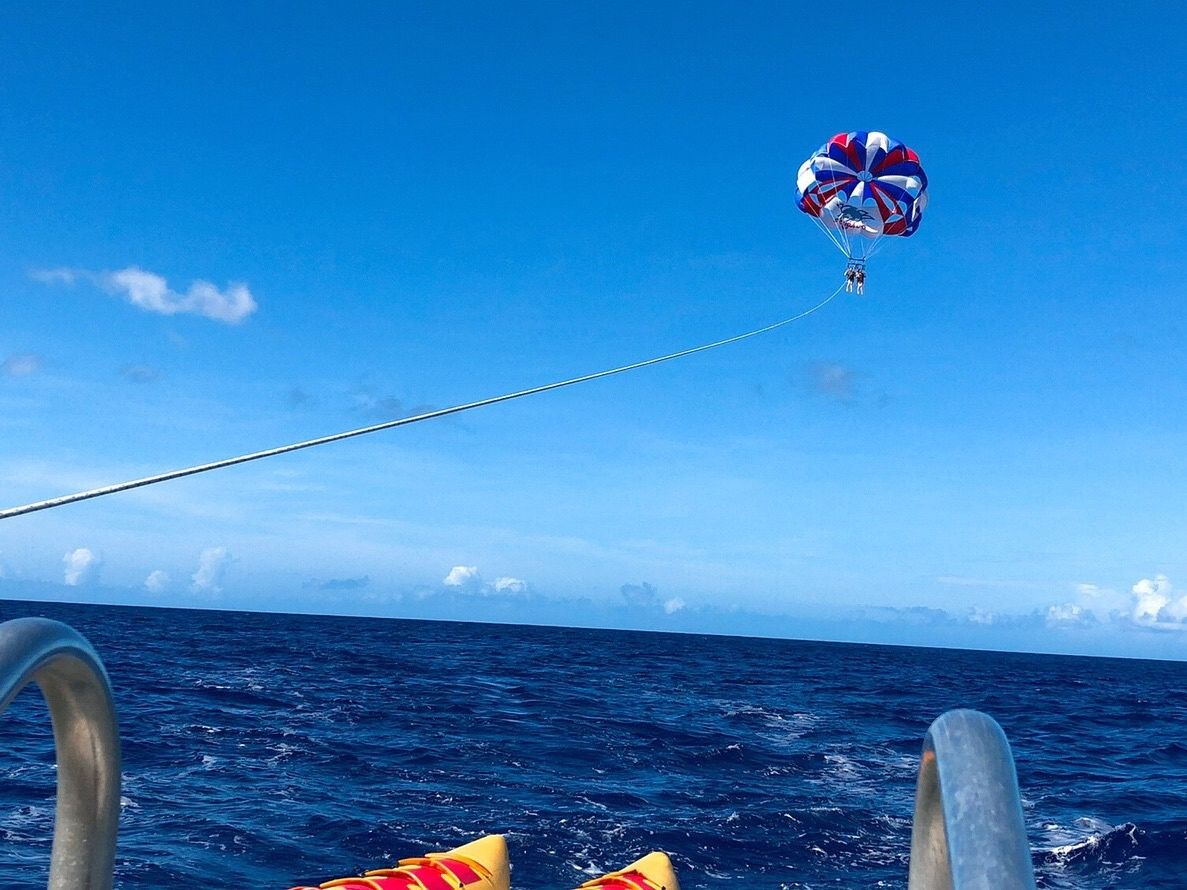 グアムについて最初にパラセーリングをしました!最初は怖そうでそんなに楽しそうでもないかなと思っていましたがやってるみと凄い楽しかったです!現地の方は最初は無愛想で怖そうだーと思っていましたが話してみると気さくでとても優しくて最高でした!
