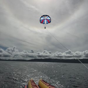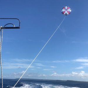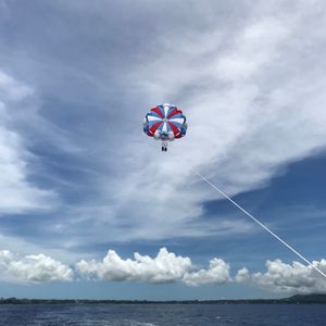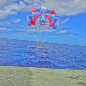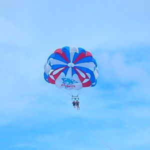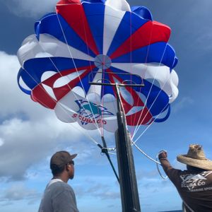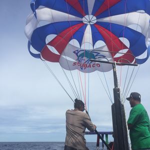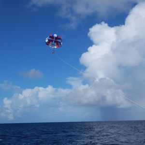 パラセーリングは3~5分くらいですが青い海を高いところから見れて気持ちよかったけど、順番を待ってる間とか移動中とか常に後ろを見ていたので船酔いを少ししました。普段酔うほうではないですが酔ってしまったので、当日の朝食や酔い止めなど気をつけたほうがよさそうです。