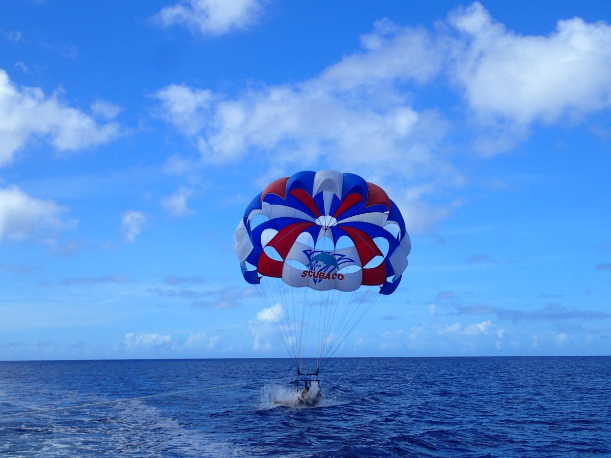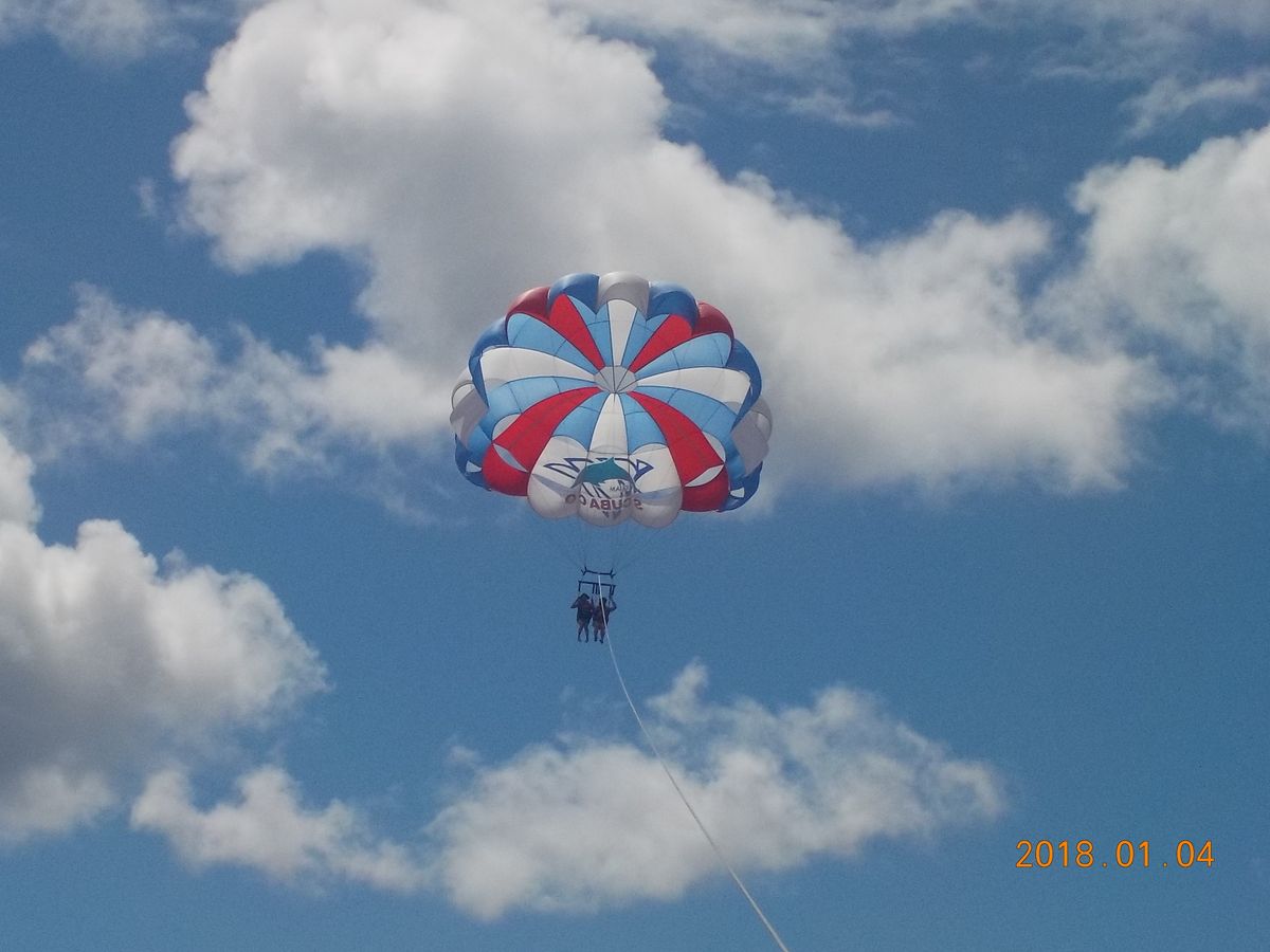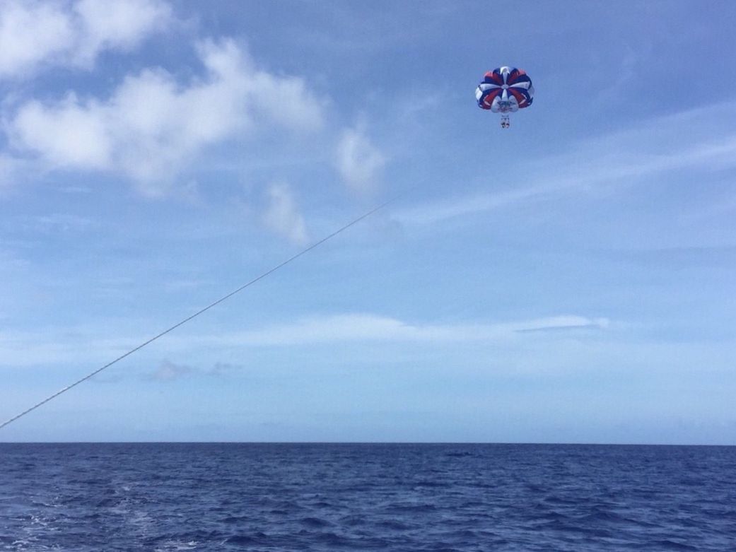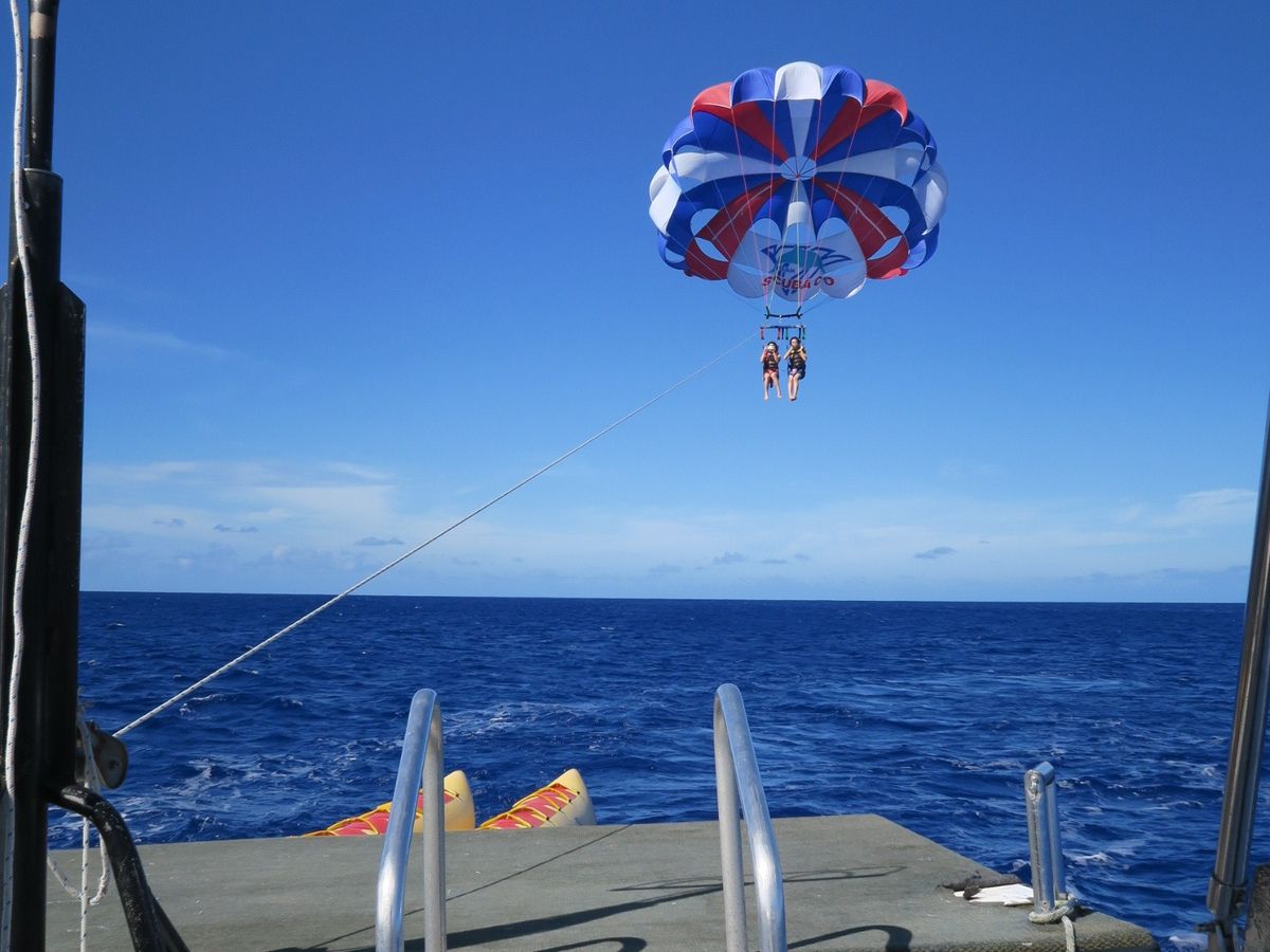 以前「バリ島」で体験して楽しかったので、機会があれば…と。今回の「グアム」のパラセーリングは、船で沖に出てからのスタート。高度も高く、滞空時間も長く、大空を満喫できました!最高です!!サービスのバナナボートも楽しかってです。