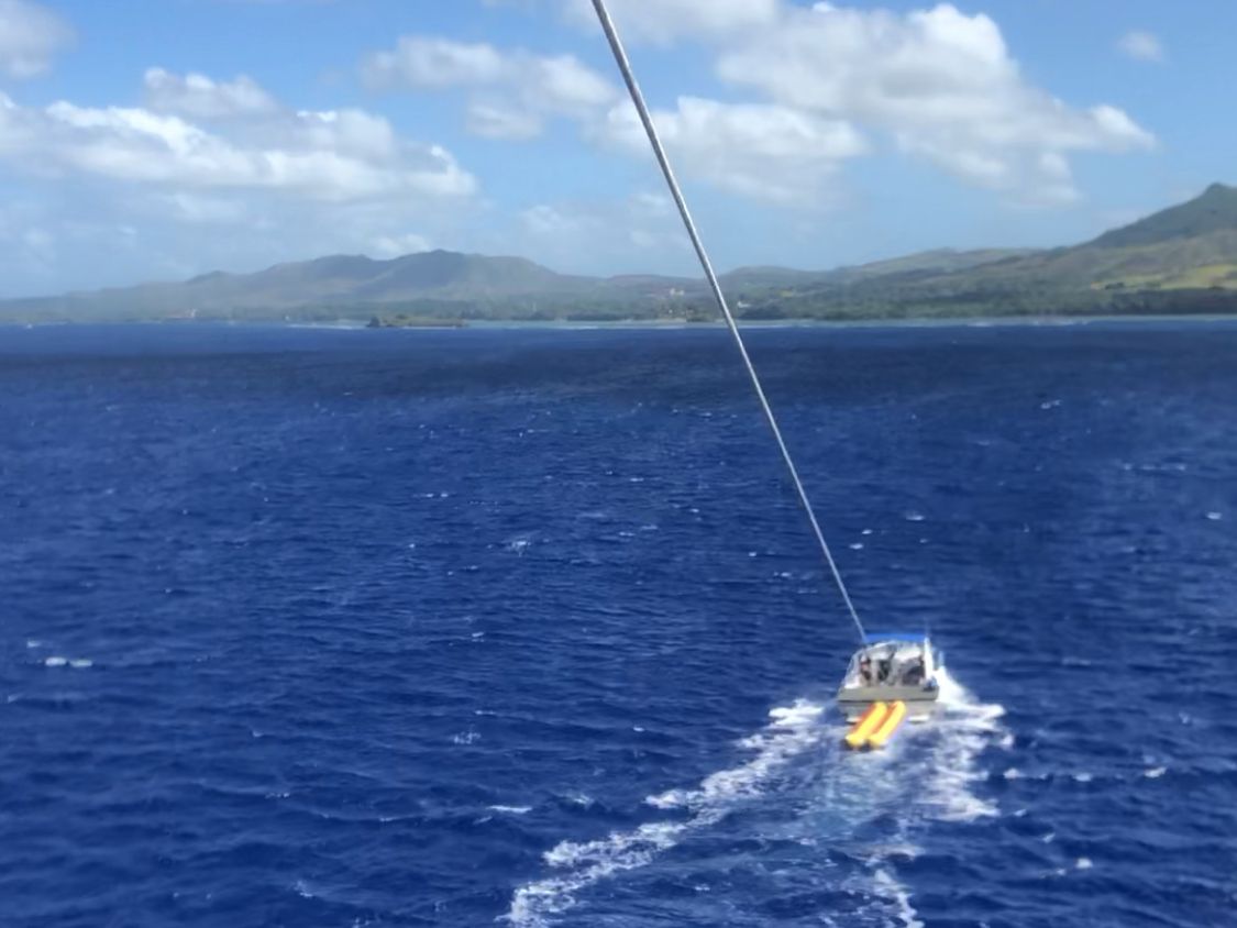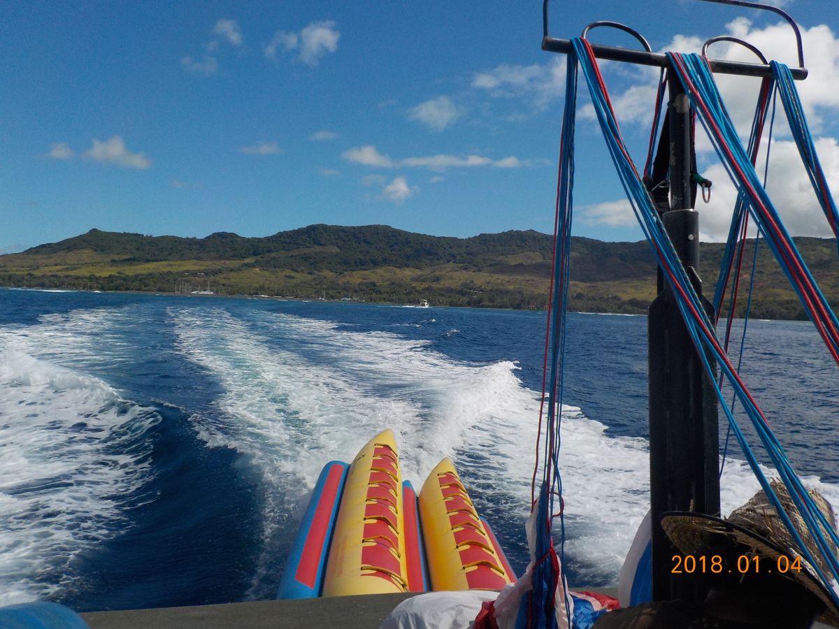 会社の同僚6人で参加しましたが、全員大満足!!これぞグアムのマリンレジャーを楽しめます。真っ青なグアムのきれいな海に感動。まずはバナナボード、フルスピードやスローでの波を受けてのスラロームなど落ちそうになるほど。パラセーリングはなかなかの高さまで上がり、1回は海にドボンと楽しませてくれます。空から見るきれいな風景を楽しむことができました。グアムの良い思い出の場となりました。