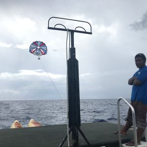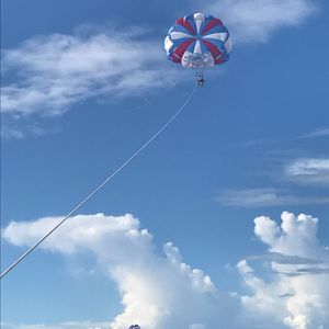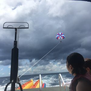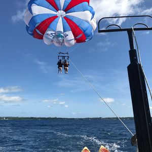 パラセーリングをやりたくて探してたところ、こちらのプランを発見。最初にバナナボートをやり、のちのパラセーリングでしたが、バナナボートの時間は結構長くてすごく楽しめました。先頭に乗った為ゴーグルを渡されましたが、うしろのゴーグルを貰わなかった人は目が痛いーっと言っていたので持参をオススメします。パラセーリングは友人と2人一緒にやりました。3人組も一緒に飛んでいたので、友達ともカップルでも楽しめます。ただ、他にグループが多いと船に乗って待っている時間が長いので、船酔いします笑 弱い方は必ず薬を飲んでからの方がいいです。かなりきもち悪くなりました。笑