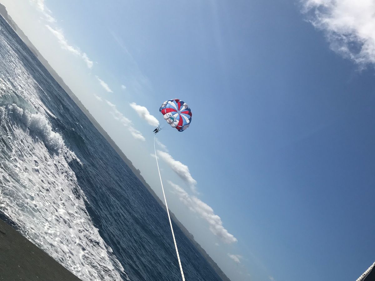 パラセーリングは楽しかったけど、そんなの忘れるくらい気分悪い方が勝ちました。全員もう二度とやらないと言ってました。高波のせいでバナナボートがなくなりましたが、無くなってくれて良かったです。早く岸に帰りたくて仕方なかったです。
