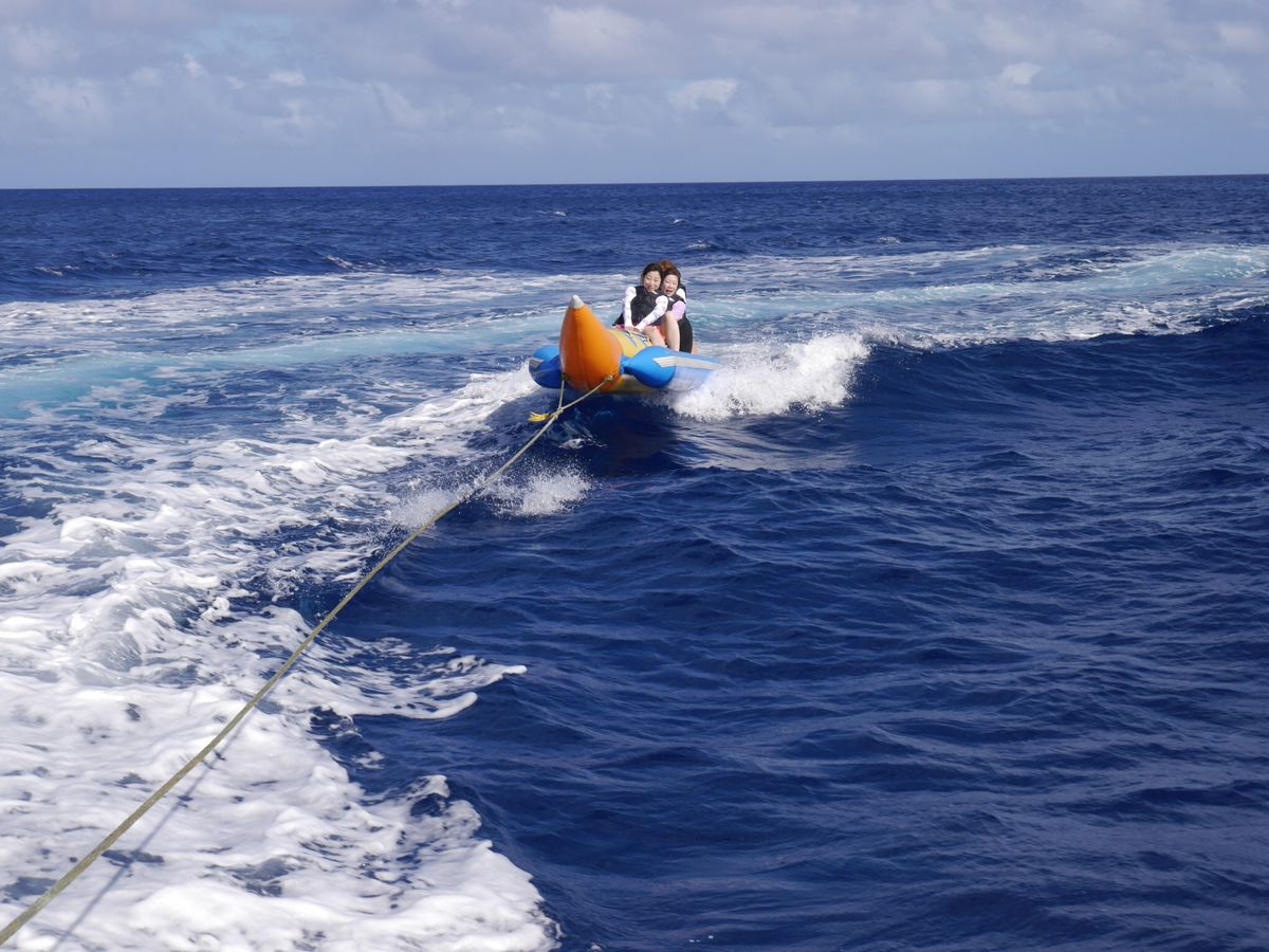 バナナボートはクルーザーで引っ張ってるからか、スピードが速いけど、あまり揺さぶられず、少し物足りませんでした。個人的には落とすくらいして欲しかったです。