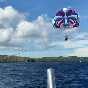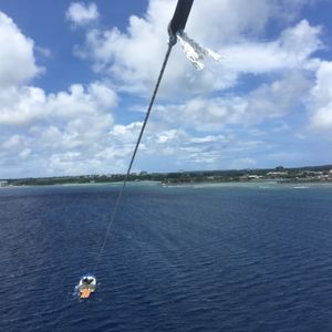 浜辺で行うジェットスキーはガイドさんの後について結構沖のほうまでいけます!30分くらい走ることができ、途中で交代してもいいよと言ってくれて彼女と交代で乗れました!後ろにつかまって乗るのもなかなか怖いです、、初めてでしたが運転が意外と難しく変な力が入ってしまい次の日筋肉痛になってしまいました!スピード感もありとても爽快でした! 次はバナナボートではなく変更可能で選んだスクリーマーとパラセーリング。スクリーマーではぐんぐんスピードをあげ、カーブを描き波の上を横滑りする状態でも必死で浮き輪にしがみつきました!パラセーリングは二人で一緒に飛ぶことができたので、興奮を分かち合うことができ大満足です。非常に高い所まで飛べるのでグアムの景色が一望でき、気持ちが良かったです。また海に落ちるギリギリまで高度を下げ足が海に着くかと思ったら、また一気に高いところへひとっ飛びで沢山ドキドキさせてもらえました。とても良いツアーでしたのでまたグアムに行った際には参加したいです!