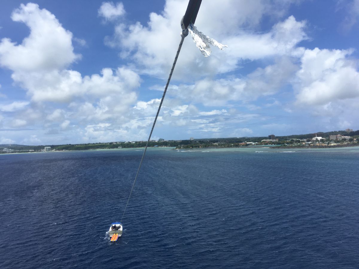 あつと言う間に上空に♪空から見るグアムは格別でした、船に戻る時には…ジャブーン!!これが又、楽しくて…最初は怖がっていた妻も…又乗りた~い