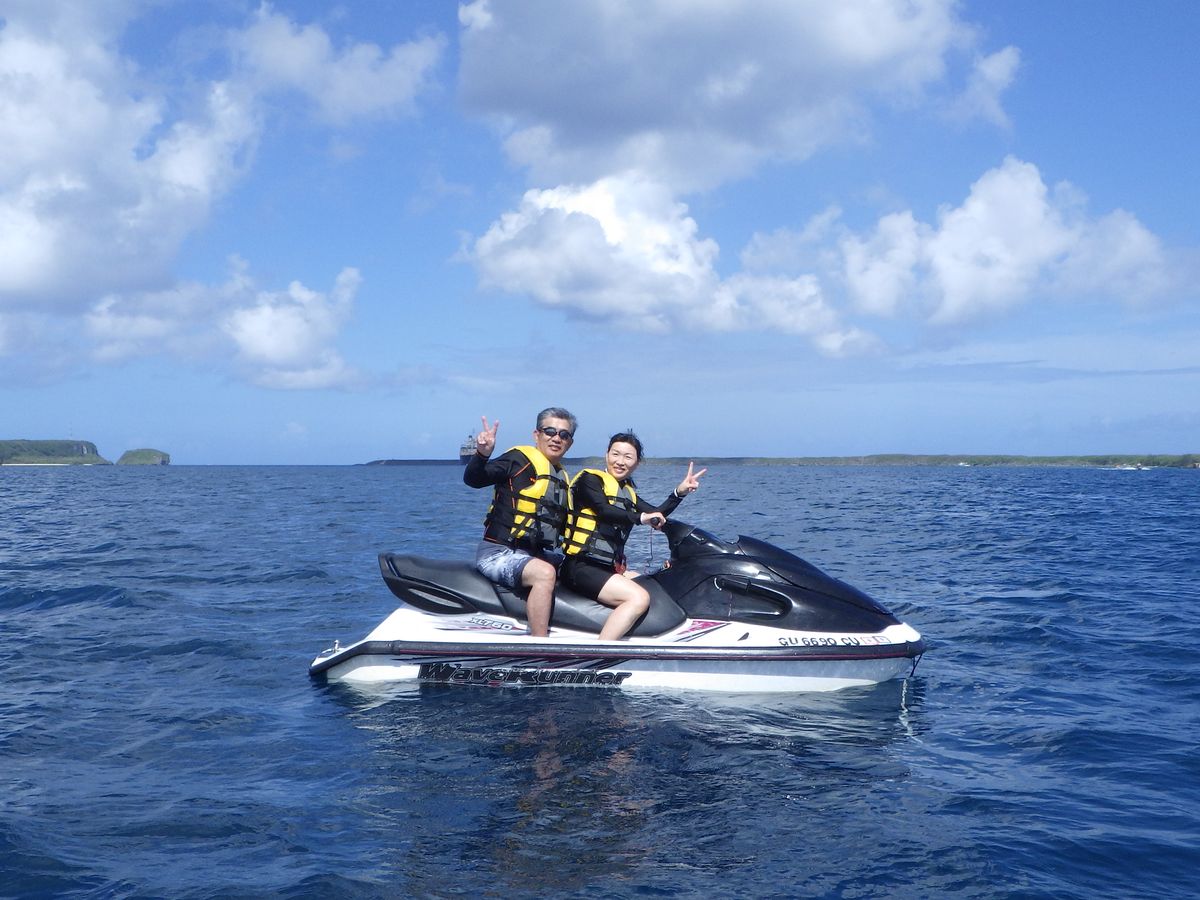 浜辺で行うジェットスキーはガイドさんの後について結構沖のほうまでいけます!30分くらい走ることができ、途中で交代してもいいよと言ってくれて彼女と交代で乗れました!後ろにつかまって乗るのもなかなか怖いです、、初めてでしたが運転が意外と難しく変な力が入ってしまい次の日筋肉痛になってしまいました!スピード感もありとても爽快でした! 次はバナナボートではなく変更可能で選んだスクリーマーとパラセーリング。スクリーマーではぐんぐんスピードをあげ、カーブを描き波の上を横滑りする状態でも必死で浮き輪にしがみつきました!パラセーリングは二人で一緒に飛ぶことができたので、興奮を分かち合うことができ大満足です。非常に高い所まで飛べるのでグアムの景色が一望でき、気持ちが良かったです。また海に落ちるギリギリまで高度を下げ足が海に着くかと思ったら、また一気に高いところへひとっ飛びで沢山ドキドキさせてもらえました。とても良いツアーでしたのでまたグアムに行った際には参加したいです!