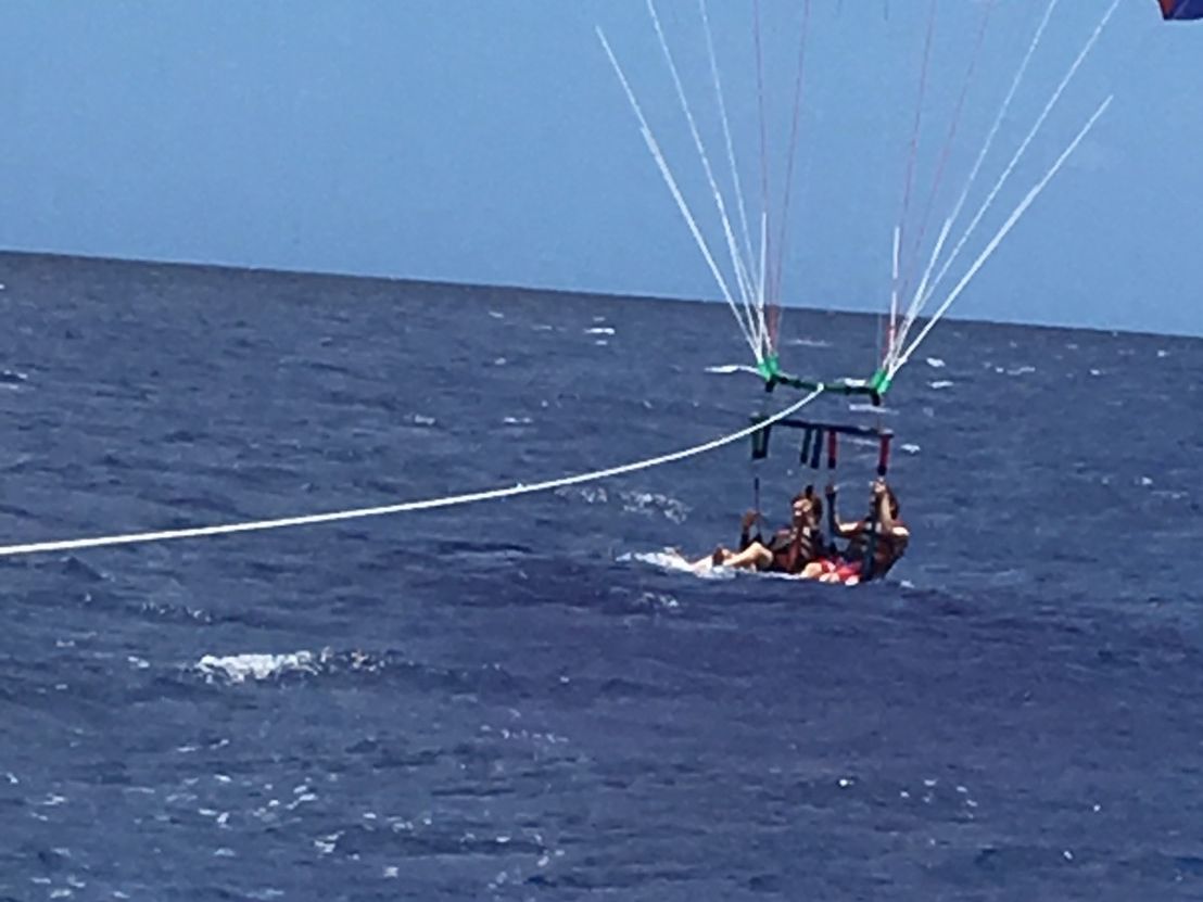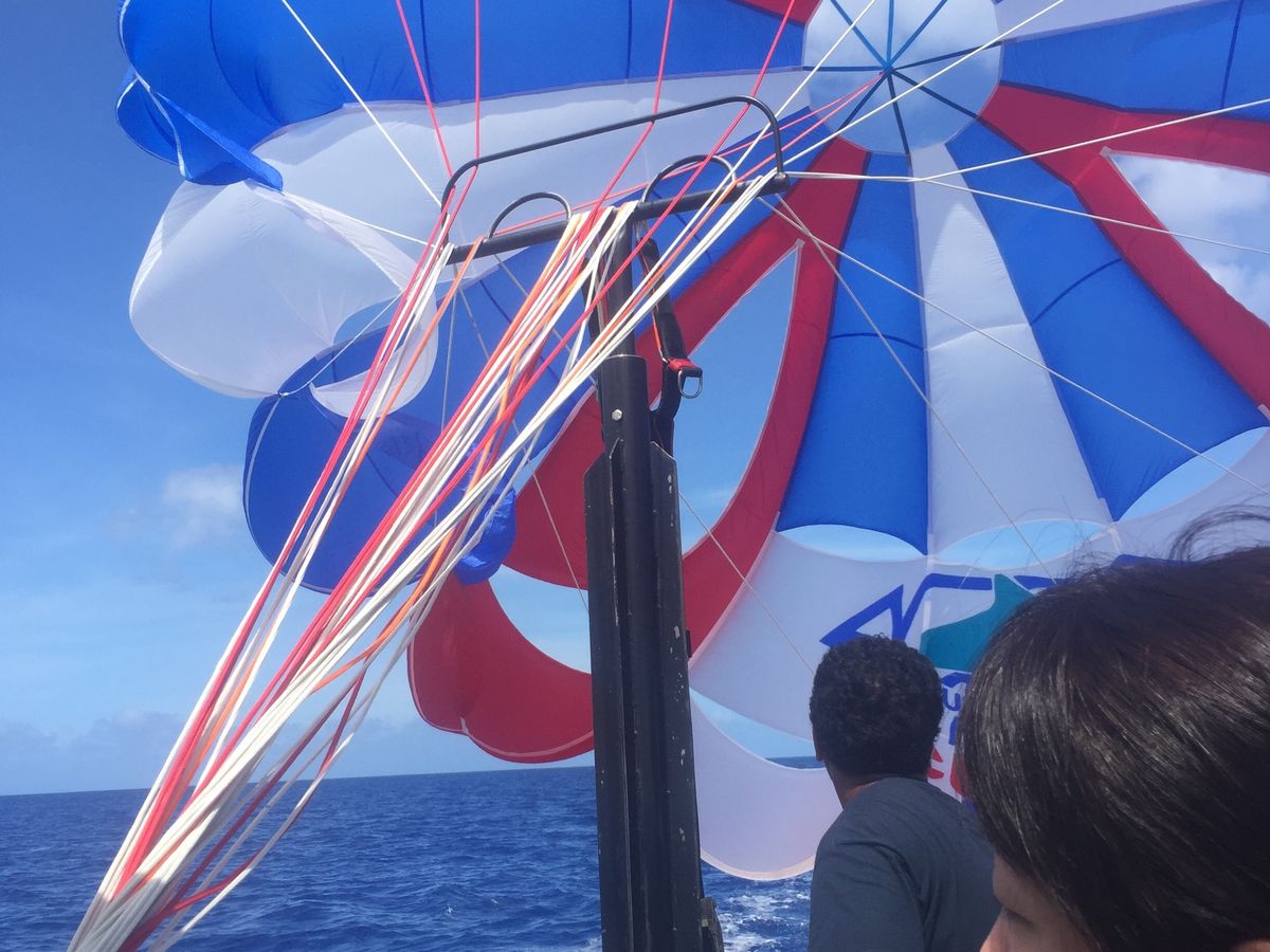 はじめに海岸まで車で送ってもらいすぐにボートへ‼︎沖に出てパラセーリングの開始でした‼︎ハーネスを装着してもらいいざ空へ‼︎すっごく気持ちよくて、もっともっとしてみたいと思いました‼︎結構長い間飛ばしてくれました♫一緒になった他の方に写真をお願いしたのですが、現地のツアー担当の方もいっぱい写真を撮ってくれました♫
