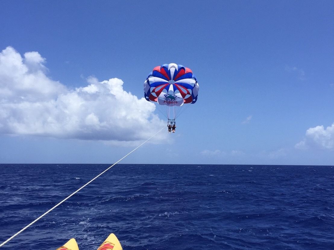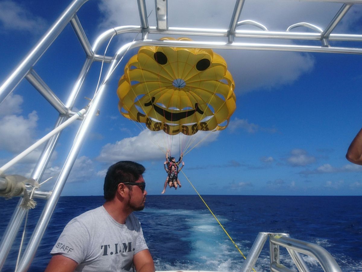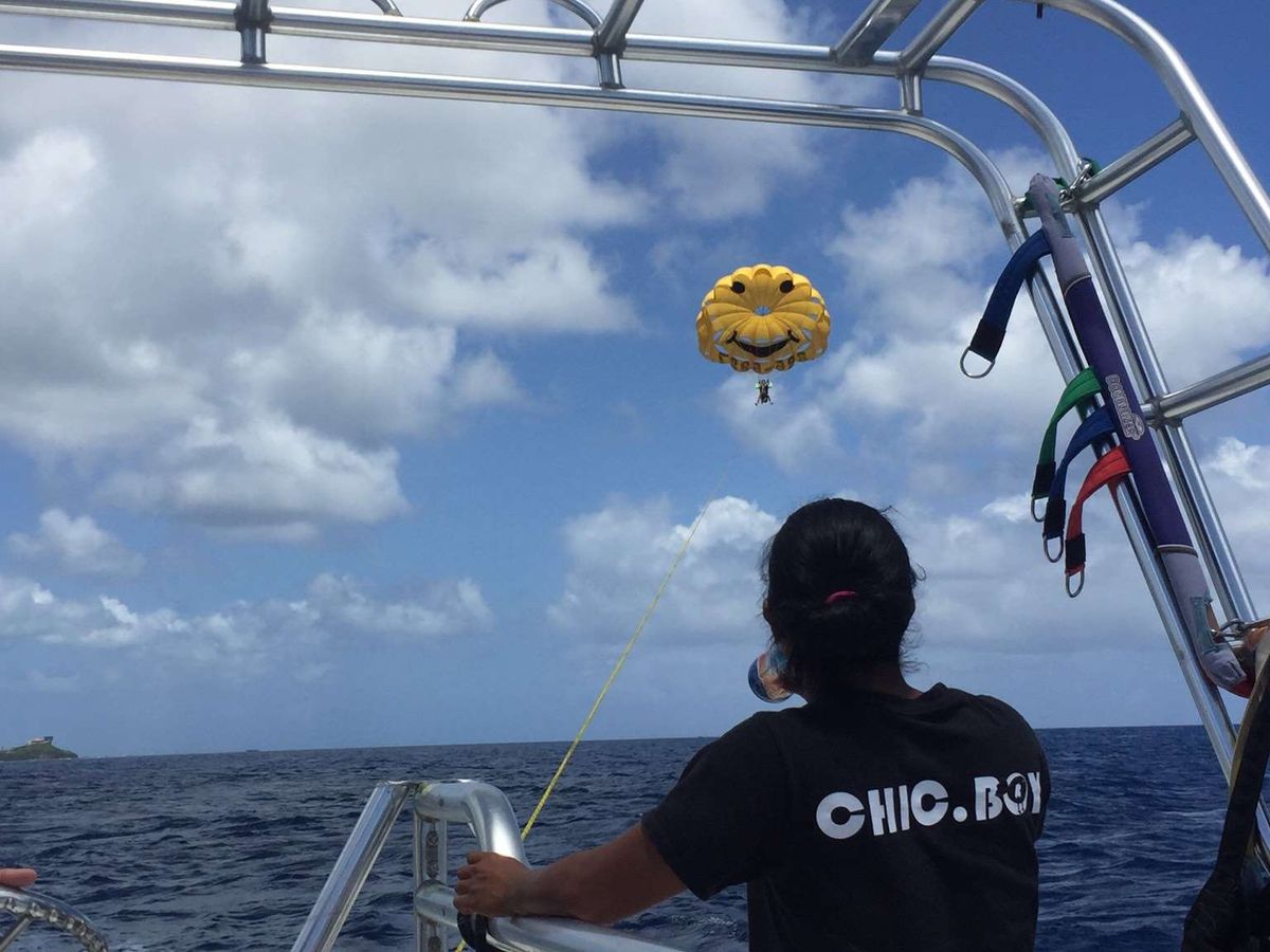 まずはホテルロビーでの待ち合わせですが、きちんと時間通りですぐに落ち合えました。今回は3組と少なく、すぐにパラセーリングの現場に着きました。雲ひとつない快晴の中淡々と進められて行きます。特に説明もないままされるがままに、ハーネスやら何やら取り付けられて行きます(笑)慣れた手つきでセッティングし,携帯を渡して完了です。スルスルと大空に吸い込まれていき、あっという間に空高く揺られていました。足元には一面ブルーの海。頭上には一面ブルーの空。感動で泣いてしまいました。風もなく全く怖くありませんでした。人数が少ないからか、かなり長い間空中を楽しませて頂きました。一生に一度はしておくべきです‼せっかくグアムに来て買い物三昧の日本人を見て つい言いそうになります(笑)場所を変えてジェットスキー。こちらもかなり長く楽しめました。二人乗りで運転手も途中で交代させてくれます。始めは運転が難しく無理かと思いましたが、インストラクターさんがゆっくり待ってくれ、最後の方はかなり楽しんで運転できました。スクリーマーは思ったよりも楽しく、引っ張ってくれるジェットスキーの運転手さんもからかいながらブンブン振り回してくれました‼お弁当はチャモロの方がお休みだったと トンカツ弁当に変更されてました。かなりちゃっちいお弁当でしたが、グアムはかなり物価が高く、朝食でも10ドル以上するのでこんなものかなぁと思いました。朝10時にホテルを出て、戻ったのが14時くらいでした。パラセーリングでは携帯は防水カバーに入れて、首から掛ければ着けていても大丈夫そうなので、一人は地上から一人は空から写真を撮れれば完璧でした。ありがとうございました。