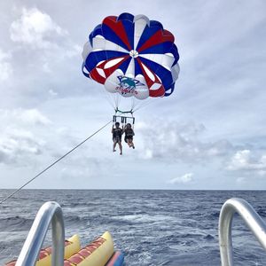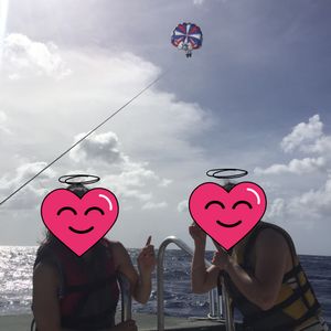 私たち夫婦と女性2人で船に乗り、まずはパラセーリングをするため、沖の方に向かいました!!!沖に向かう途中にウミガメを見れて、とってもラッキーでした❤さすがにイルカは見れなかったです(笑)パラセーリングできるところまで行き、いよいよ人生初のパラセーリング!