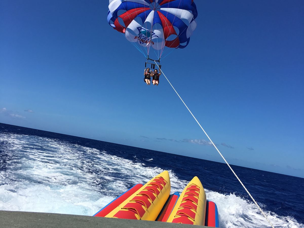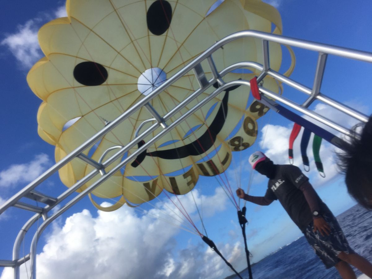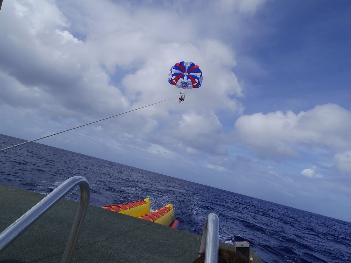 次はパラセーリングです。パラセーリングは、パラセーリング場所に行くまでが波が高く酔ってしまいました。しかし、実際にパラセーリング中はそれを忘れるくらいキレイな景色が見れて大満足でした!!!!ただ、自分が想像していたよりも高く上がるので高所恐怖症の方には厳しいかもしれないです、、