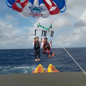 グアムの空と海と陸の絶景を上空から見渡すアクティビティ、パラセーリング。パラシュートに体を固定し、ボートに引っ張られながらグアム上空へ約30m上昇。スリリングな感覚を味わいながらゆっくり空中散歩。島全体を覆いつくすビッグスケールのジャングルや、透明度抜群の海とサンゴ礁を見下ろせます。親子ペアで2人乗りもできるので、お子様(5歳以上)連れのご家族にもおすすめ。