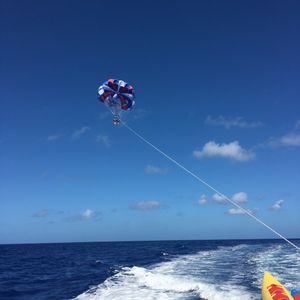 やっと来たと思ったらお弁当を買ってきていて、先にランチ!と11時前に言われ食べました。チキンがおいしかったです。パラセーリングの場所に着くと、今度はボートが他のお客さんが使っていてありませんでした。また20分くらい日陰で待たされました。全体的に待ち時間が長くて疲れましたが、パラセーリングは高く上がり気持ちよくて大満足でした。
