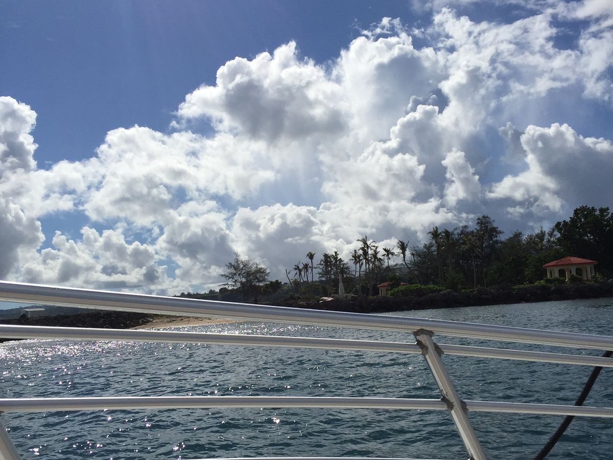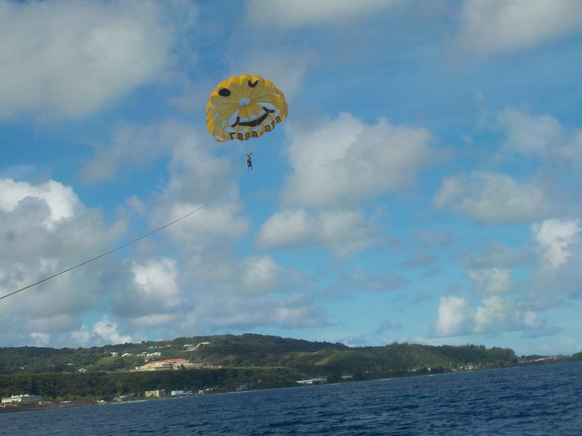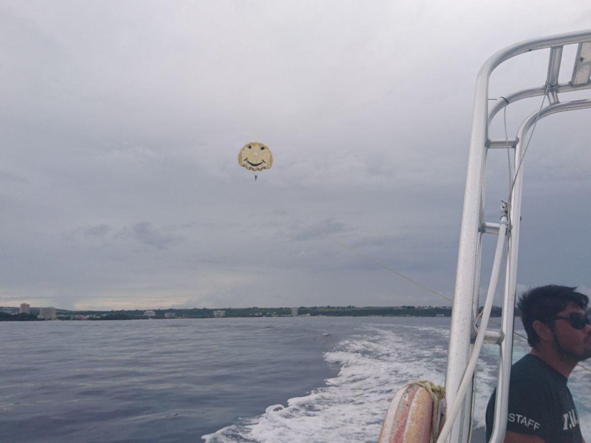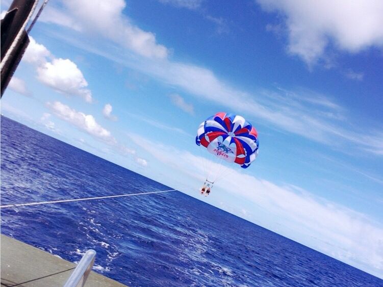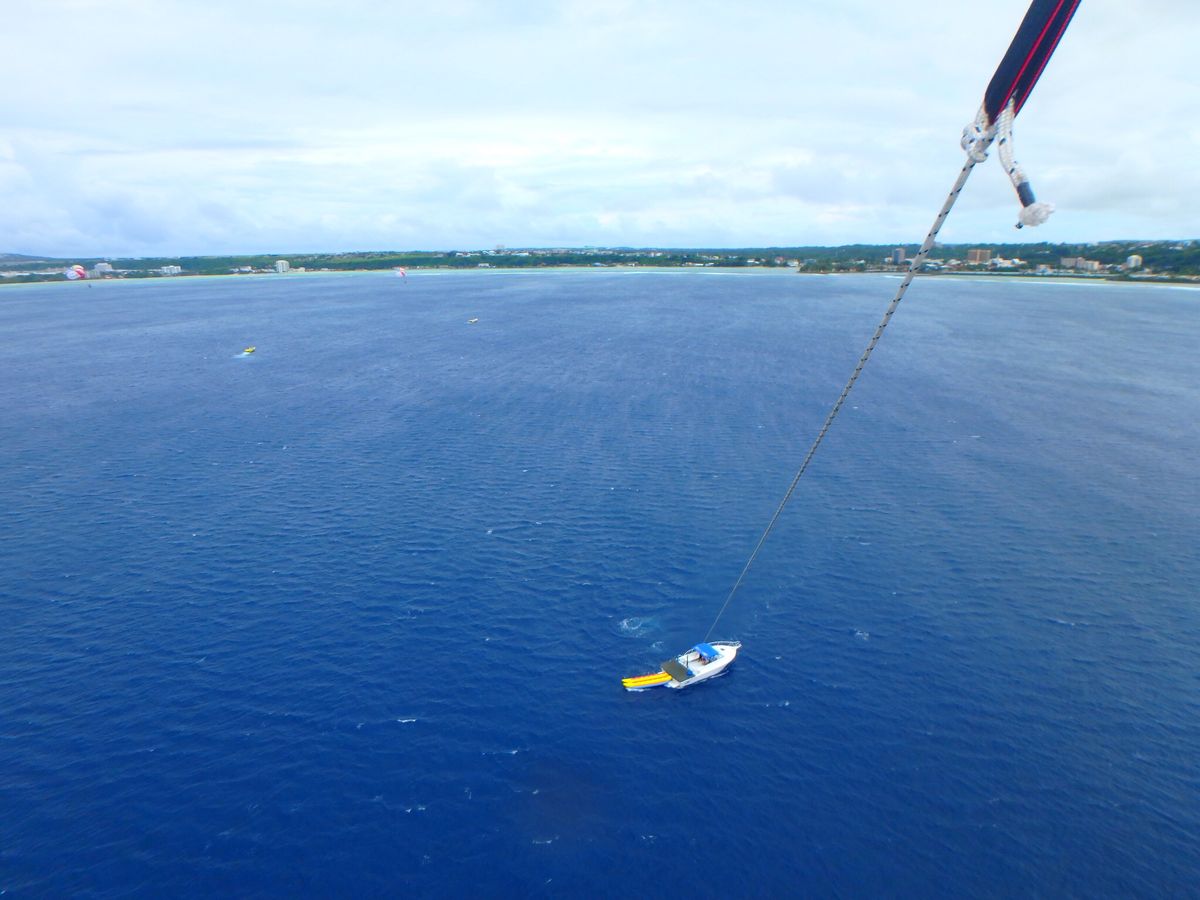 パラセーリングをする前にスコールに当たってしまいびしょ濡れになりましたが、その後晴れた場所でパラセーリングをすることができました。空を飛びながらグアムを一望できとてもいい経験になりました。