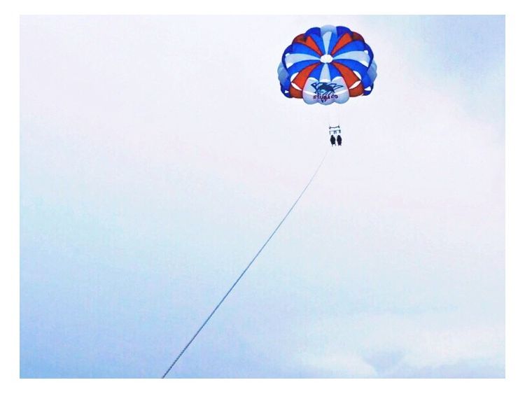 まず、パラセーリングは2人乗りかと思いきや、今日は1人ずつ乗ろう!とスタッフさん。最初は怖かったですが、空の上は意外とゆったりした時間で優雅に空中散歩。カメラを渡せば、遠近法で手のひらに乗せているような写真とか色々遊びながら撮ってくれます。