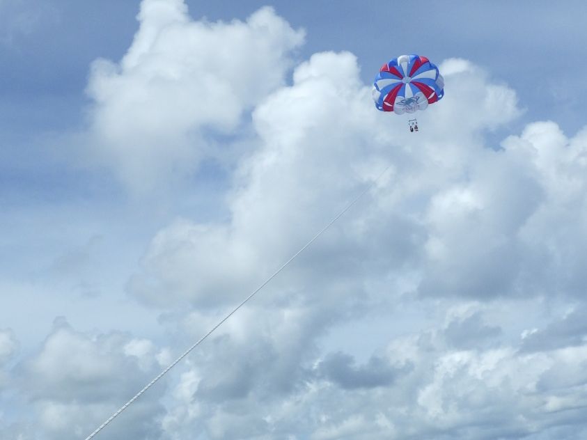 パラセーリングは、二人乗りでした。天気が良ければ、最高の眺めだと思います。高さもかなりあるので、高所恐怖症だと怖いくらいです。バナナボートは、パラセーリングに行く途中に乗るのですが、短かく感じてしまいました。落とされるとかはなかったです。
