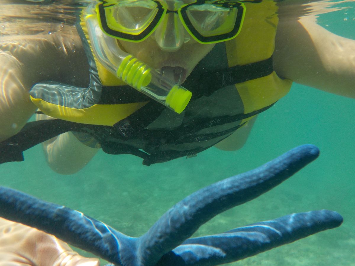 青いヒトデを捕まえて渡してくれたり、きれいな貝殻を潜って渡してもらったりと、楽しませてもらいました。
