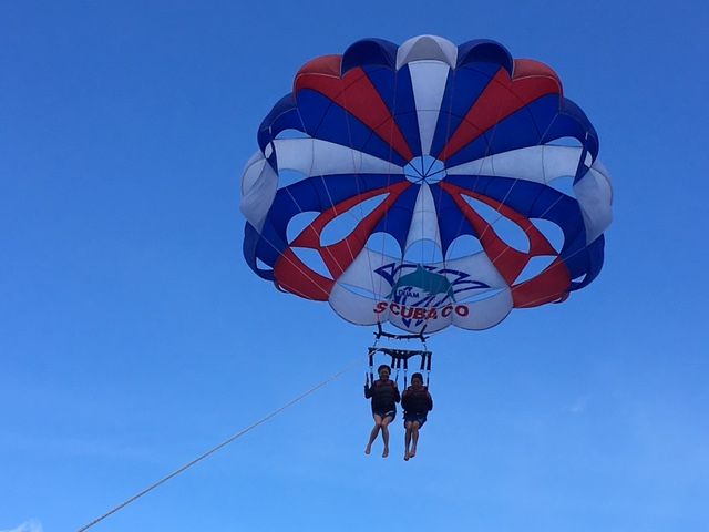 初パラセーリング!とっても楽しかったです。上空から見た青い海がとても美しく、船長さんの絶妙な運転でザバンと海に一瞬落としてくれました。小さなお子さんはふわっと着水していたので、怖い人も安心だと思います。約5分の空の旅です。バナナボートはゆっくりだったので激しいのが好きな人は他のを楽しんだらいいと思います。