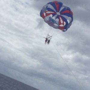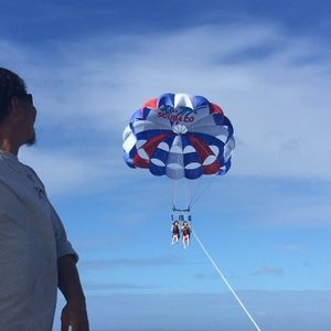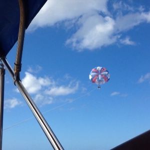 バナナボートのあと、またお迎え来て頂いて別のビーチへ。それからまたボートに乗っていよいよパラセーリング!空に上がる瞬間が、スリルがあり、空から見た景色はとてもキレイでした。パラセーリング中の写真も撮ってくださいました!