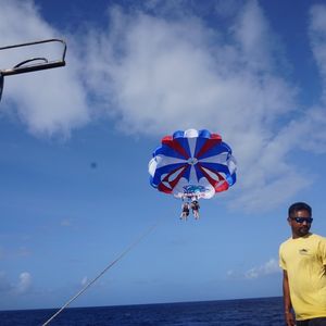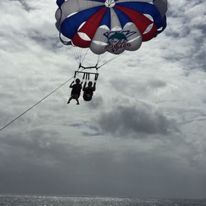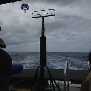 船でパラセーリング地点まで移動し、天気が少し荒れた為、雨が止むまで船で待ちました。待っている最中も現地のスタッフが面白いことを言ったりして、退屈しませんでした。海の上で待っていると風が強く少し寒く感じるので、羽織るものを持っていくことをおすすめします。結果、雨でも楽しめました。少し飛んでいる時間が短く感じました。もう少し長く空の上で景色を眺めていたかったです。