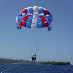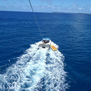 新婚旅行で参加させていただきました。バナナボートは揺れは少なく程よく楽しめました!その後のパラセイリングでは機械の故障があり、船を乗り換えるというハプニングがありましたが、その分海の上をぼーっと揺られる時間が長く気持ちよかったです!イルカも見ることができラッキーでした!他の会社のパラセイリングと比べるとスピード感はないようでしたが、どこよりもロープが長く高く飛んでいたので、空から見るグアムの景色は最高でした!
