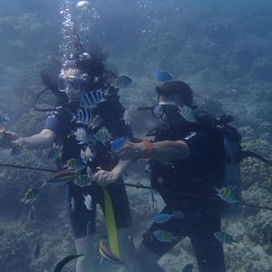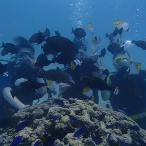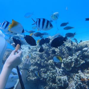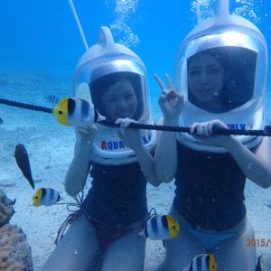 そして一番の醍醐味で参加したアクアウォーク!陽気なスタッフさんの丁寧な前指導があり初めての潜水でしたが安心して海に潜ることができました。海に潜ってみると予想を超える熱帯魚の数!その中で餌やり体験もでき南の国ならではの体験をできました。