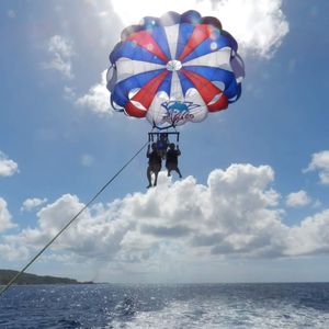 グアムの空と海と陸の絶景を上空から見渡すアクティビティ、パラセーリング。パラシュートに体を固定し、ボートに引っ張られながらグアム上空へ約30m上昇。スリリングな感覚を味わいながらゆっくり空中散歩。島全体を覆いつくすビッグスケールのジャングルや、透明度抜群の海とサンゴ礁を見下ろせます。親子ペアで2人乗りもできるので、お子様(5歳以上)連れのご家族にもおすすめ。