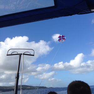 船に乗り込み、先ずはパラセイリングを体験しましたが、いきなりハーネスを付けられ心の準備が出来る前にtake off!!
