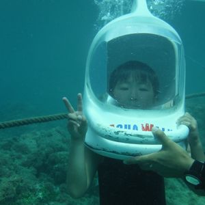 家族3人で参加。奇数のため、パラセーリングを娘が2度チャレンジさせてもらえました。行き帰りを、バナナボートに乗れたので楽しかったし、船酔いを避けれたかも。アクアウオークは、メガネでも、化粧をしていても水が怖くても、問題なし。束の間の、水中散歩を優雅に楽しめます。湾に近くても、たくさんの熱帯魚がいて、本当に感動しました。心配した耳抜きも簡単でした。スタッフも楽しい人ばかりで今回1番のグアムの思い出となりました。