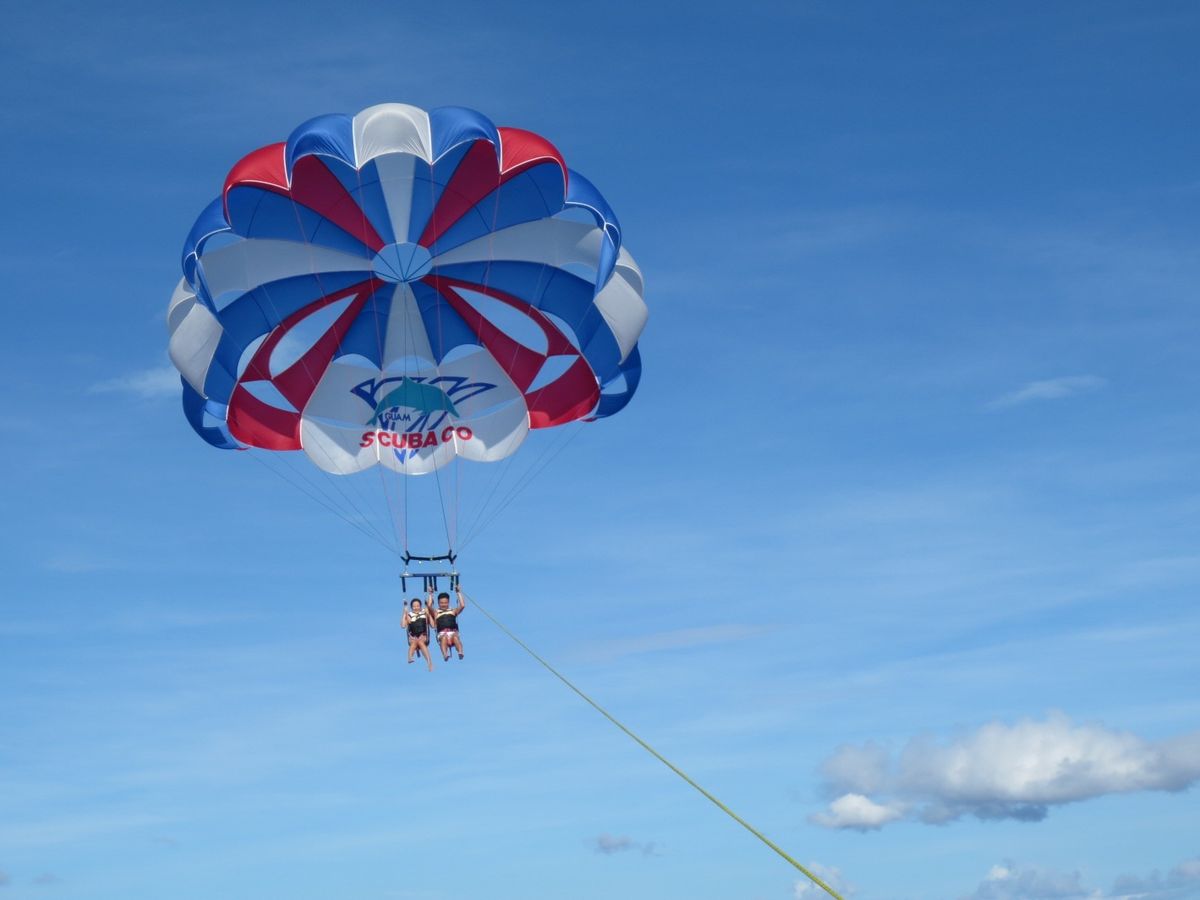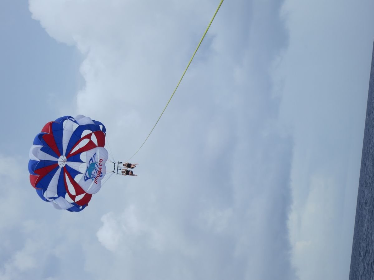バナナボートもパラセイリングも浜辺の方からスタートするのかと思ってましたが、小型ボートで沖まで行ってからでした。まず、バナナボートからしました。バナナボートはすごく楽しかったです。次に、パラセイリングで、2人一組で同じボートから7、8組くらい飛んだのですが、パラセイリングを装着する間、ボートは動きを止めて波にゆらゆら揺らされていたので、私は結構船酔いしてしまって大変でした。同じボートで何人か船酔いしている人がいました。でも、空中でいる間は気持ちよかったです!思っていたより高く飛びました。下降するときは、最後に海にポチャンとつかりましたが、これはおきまりみたいです。乗り物酔いする人は、酔い止め薬を絶対に飲んでおいたほうがいいです!