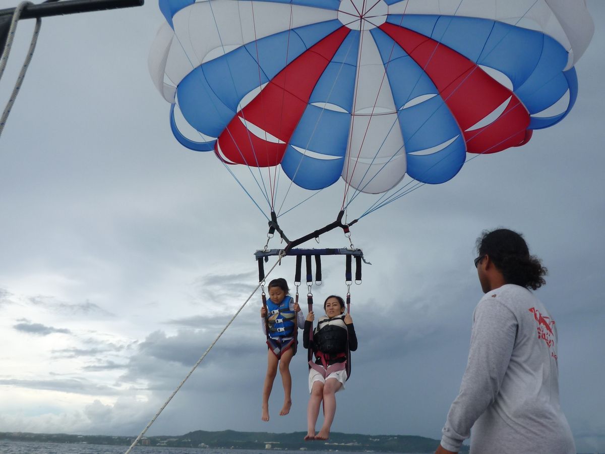 9歳の娘と夫と私の3人で参加しました。初体験のパラセイリングはとても気持ち良く、楽しかったです。上空はボートのモーター音も波の音も聞こえず、とても静かで驚きました。2人乗りだったため、娘が2回(私とペア+夫とペア)体験させていただけて、大満足でした。ホテルの送迎つきが有り難いです。次回グアムに行く際、また参加したいです。