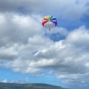 ジェット船に乗り込み、STAFFの方が親切にライフジャケットやパラセイリング用ベルトをつけて下さり、波しぶきや海風が激しいので若干スリリングを感じながらそうこうしているうちに可愛い虹色のパラシュートが!超映えます。とにかく映えまくる。
