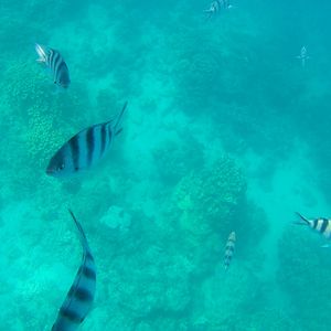 船に乗り込む際、現地STAFFが「サカナ、サカナイルヨ!」と指を指した桟橋付近には大きなアクアブルー色の熱帯魚が!その直後には可愛らしい熱帯魚がたくさん!感動(´;ω;`)