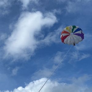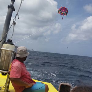 ボートに乗る前に器具を装着し、いざ出発。ボートでは、現地の方が2名で簡単な日本語が話せる方で気さくな方でした。パラセーリング自体は、最初に娘2人が一緒に飛んで、次に私が1人で。私の番にどちらかの娘と一緒に飛べるように相談しましたが、風が弱いから重量的に今日は飛べないとの事で断念。確かに娘2人の時も、飛び立ってから一旦足が水面に着くまで降下していましたから、ギリギリだったのかな?条件が良ければ、対応してくれそうな感じでした。実際に飛んでいた時間は3分程度でしたので、予約サイトでの5〜8分よりも少し短かったのが残念。発着場に戻った後に、日本人スタッフの方との雑談で、お勧めのお店とかを教えてもらい、とても参考になって助かりました。