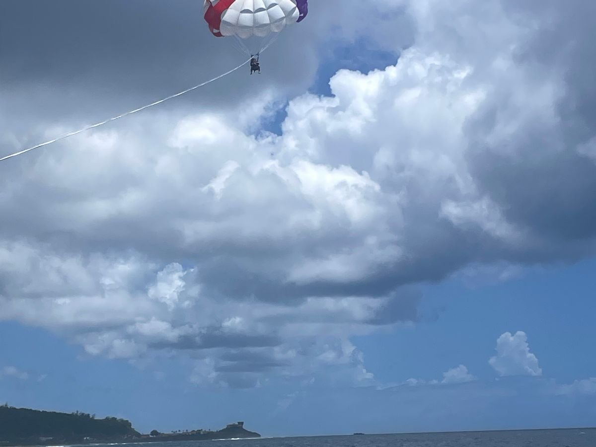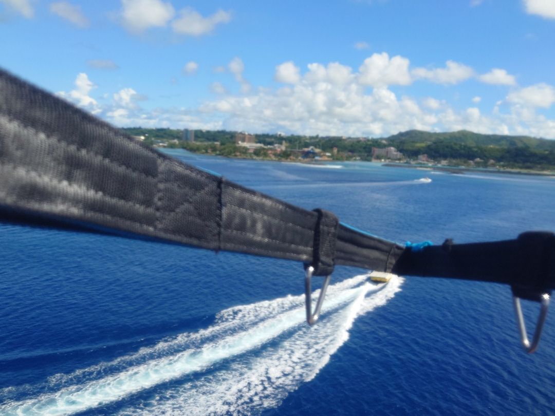 送迎は頼まずレンタカーで直接行きました。指定された場所はハガニアで着いてすぐハーネスつけられボート乗せられスタートです。2人で上がるタイプです。ボートの船尾から舞い上がり濡れることは基本的にありません。まずは妻子から。見てるほうもドキドキですが子供は楽しんでました。他の書き込みで3人家族のケースで子供2回飛べたとあったのでそのつもりでいましたが、自分は1人でした。最近高いところが苦手になりつつある自分には罰ゲームなくらいドキドキでした。景色や爽快感は申し分ないです。でもロープ切れたら終わりだなとか、スリルも申し分ないです。結構長く感じました。