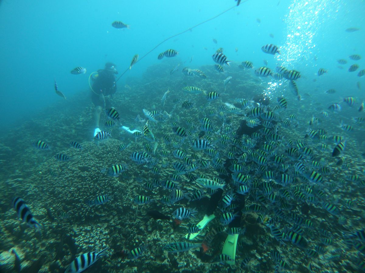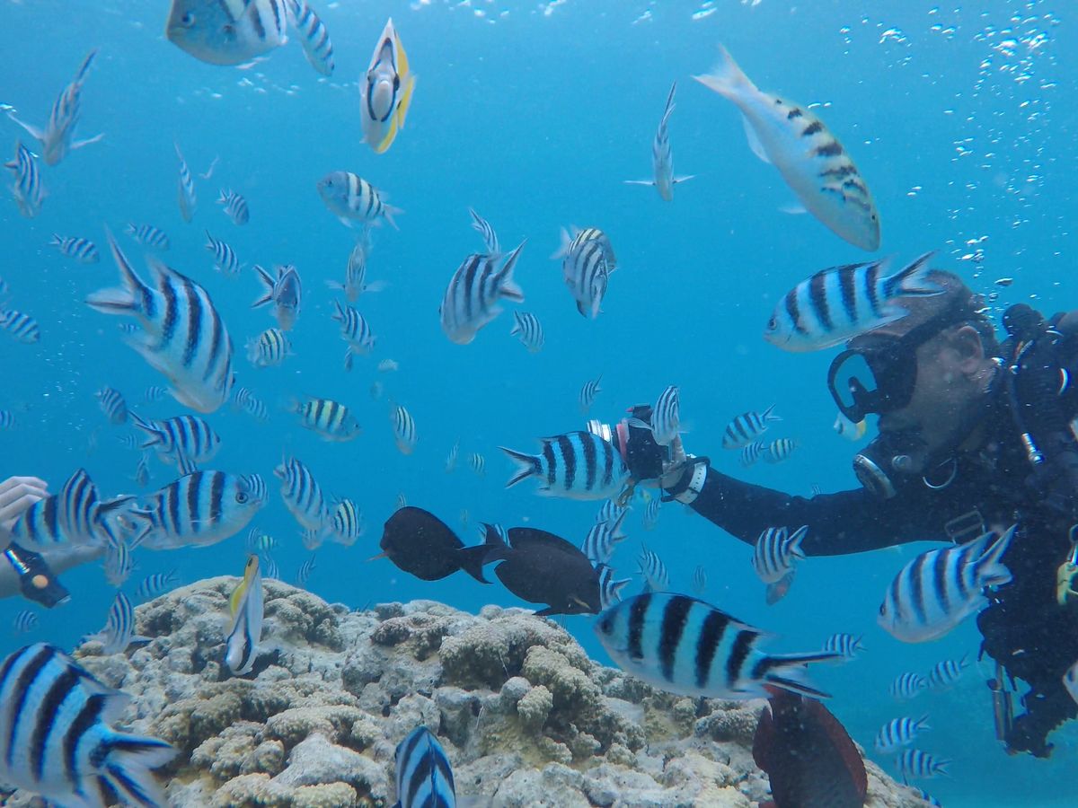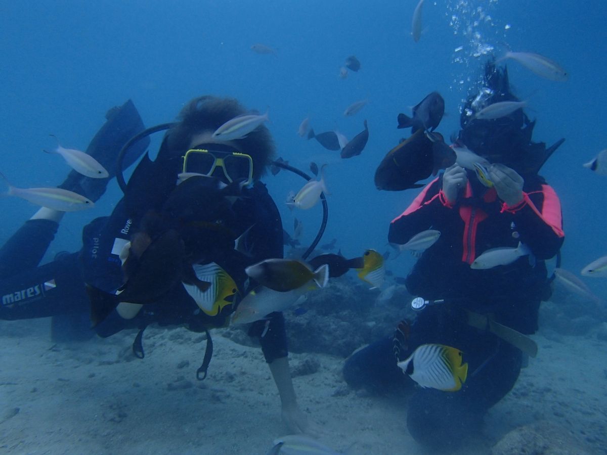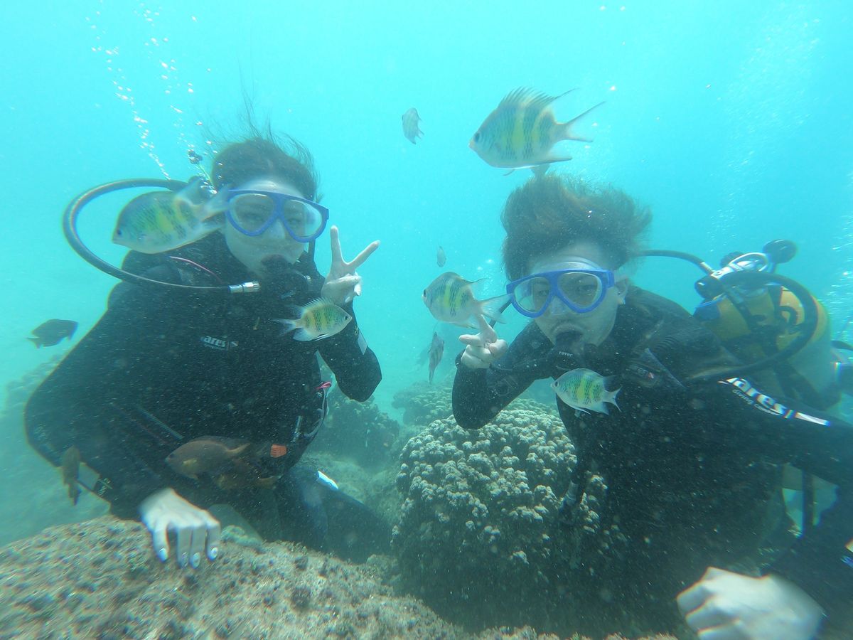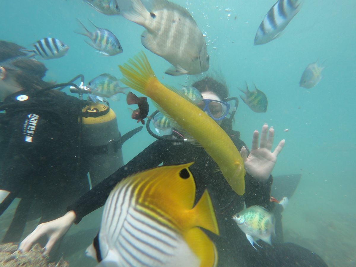 ダイビング初心者と参加しました。日本人インストラクターが親切で初心者もで安心して体験でき満足できました。魚も種類多くて、何より自分の目の前で餌を与える体験が一番面白かったです。顔の前が魚だらけ。